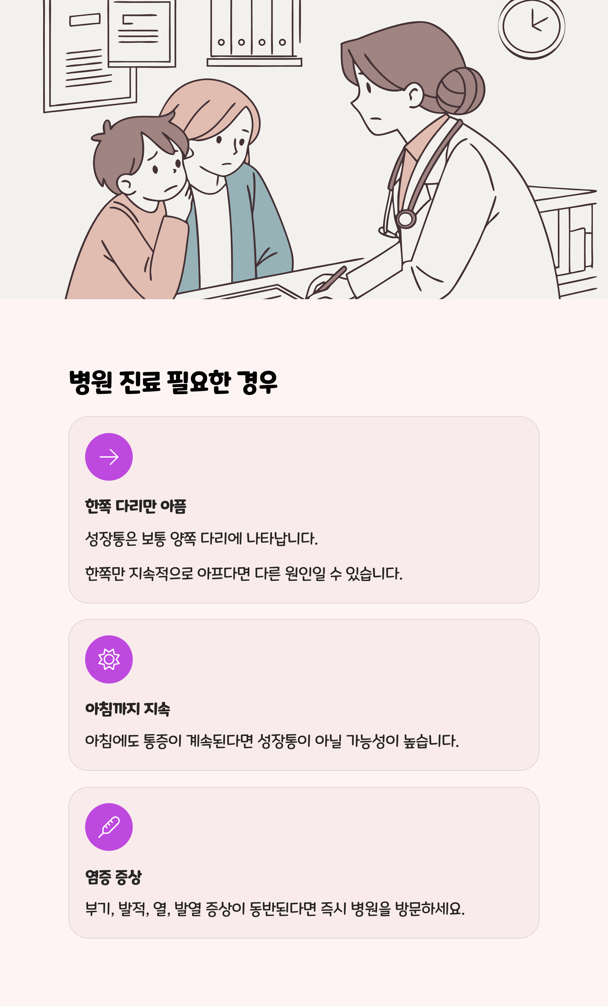 | 구분 | 일반 성장통 특징 | 병원 방문이 꼭 필요한 경우 |