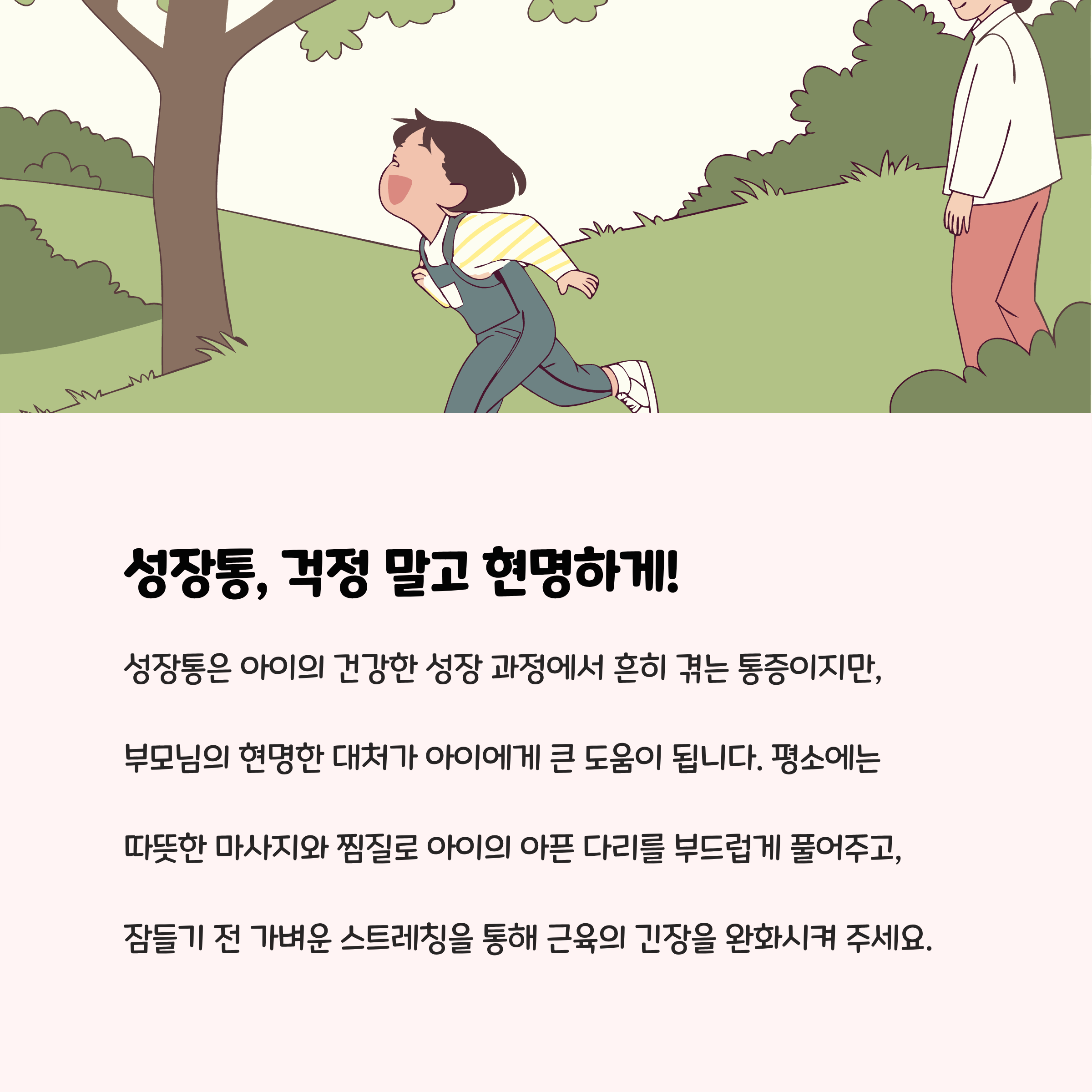 허벅지, 종아리 근육을 중심으로 가벼운 스트레칭을 시켜주면 근육의 긴장이 풀리고 성장판 자극에도 도움이 됩니다. 단, 과도한 운동이나 무리한 신체활동은 피하세요.