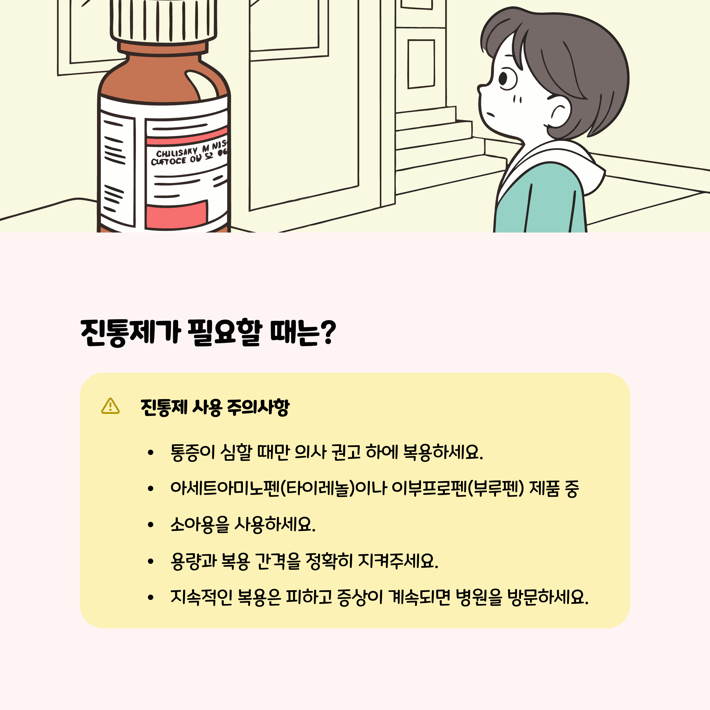통증이 심할 때는 이부프로펜, 아세트아미노펜 계열의 진통제를 일시적으로 복용할 수 있으며, 복용 전 용량과 방법은 의료진 또는 약사 안내를 반드시 따르세요.