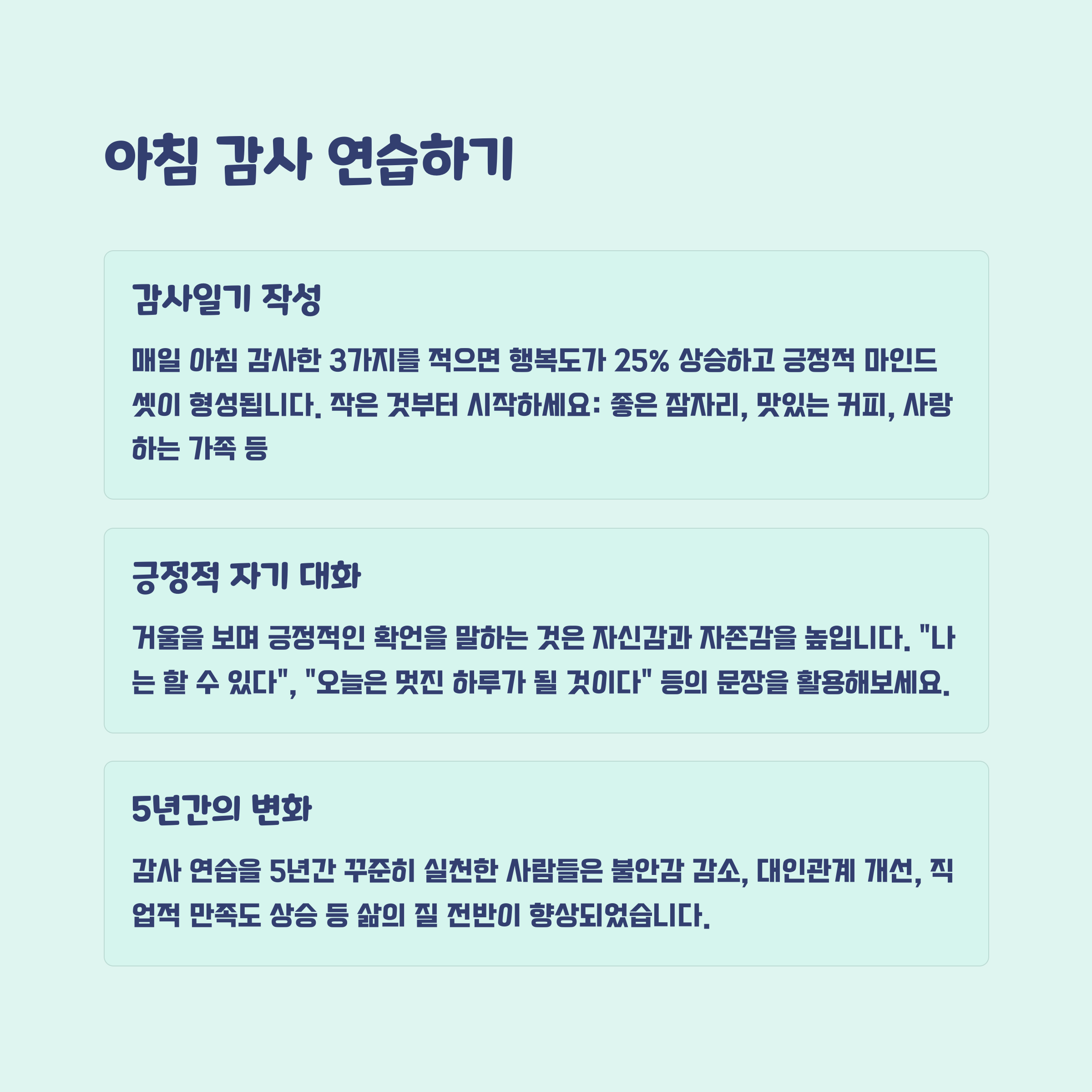 감사하는 마음으로 하루를 시작하면 스트레스가 줄어들고 긍정적인 기운이 생깁니다. 감사 일기를 쓰거나 감사의 말을 스스로에게 되뇌어보세요.