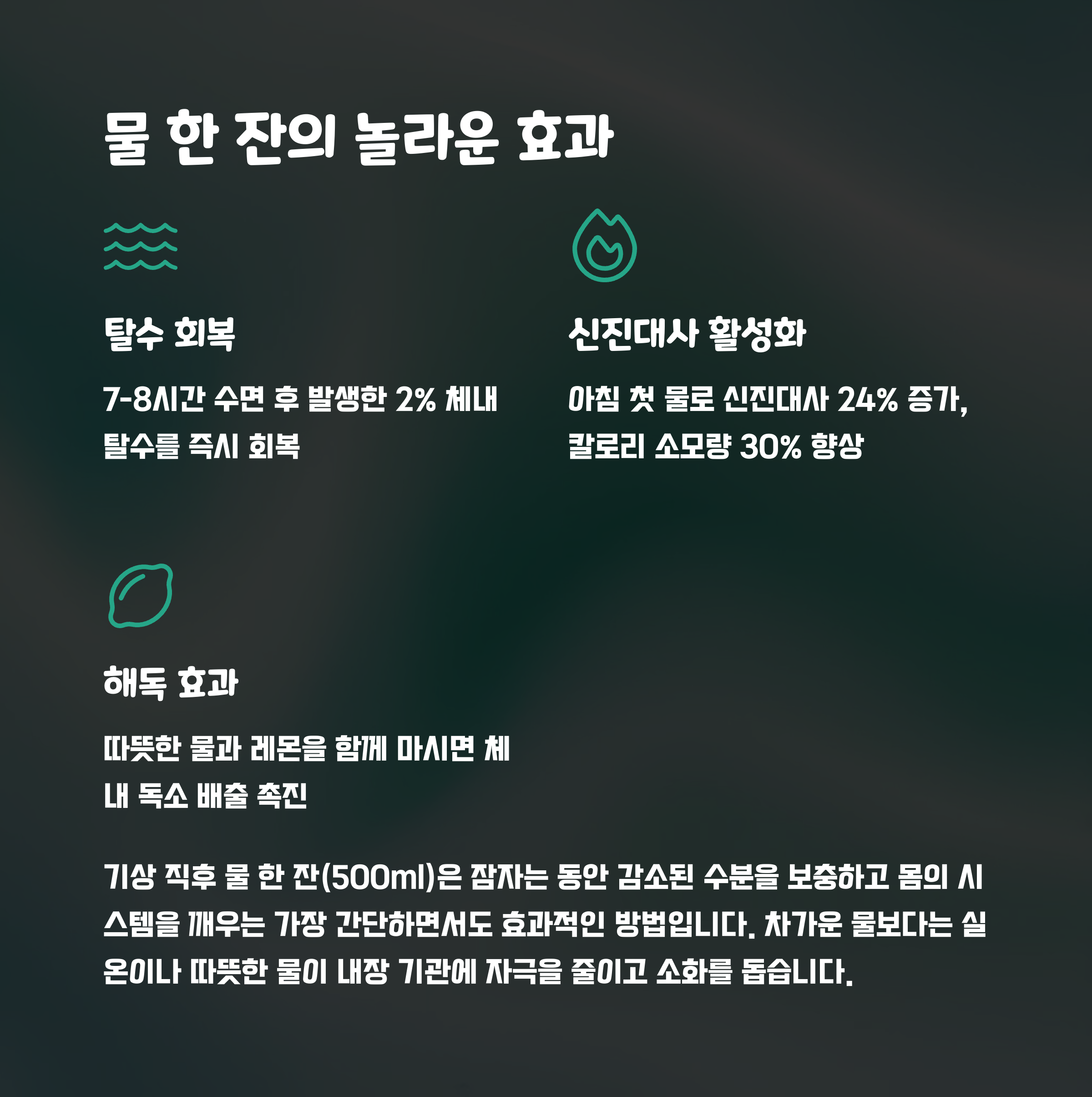 밤사이 우리는 땀을 흘리며 체내 수분을 잃게 됩니다. 아침에 일어나자마자 물 한 잔을 마시는 것은 이러한 수분 손실을 보충하고 신진대사를 활성화시키는 데 필수적입니다. 연구에 따르면 아침에 물을 마시는 습관은 신체 각성을 돕고, 아침 식사 전에 물을 섭취하면 포만감을 느껴 과식을 예방할 수도 있습니다.