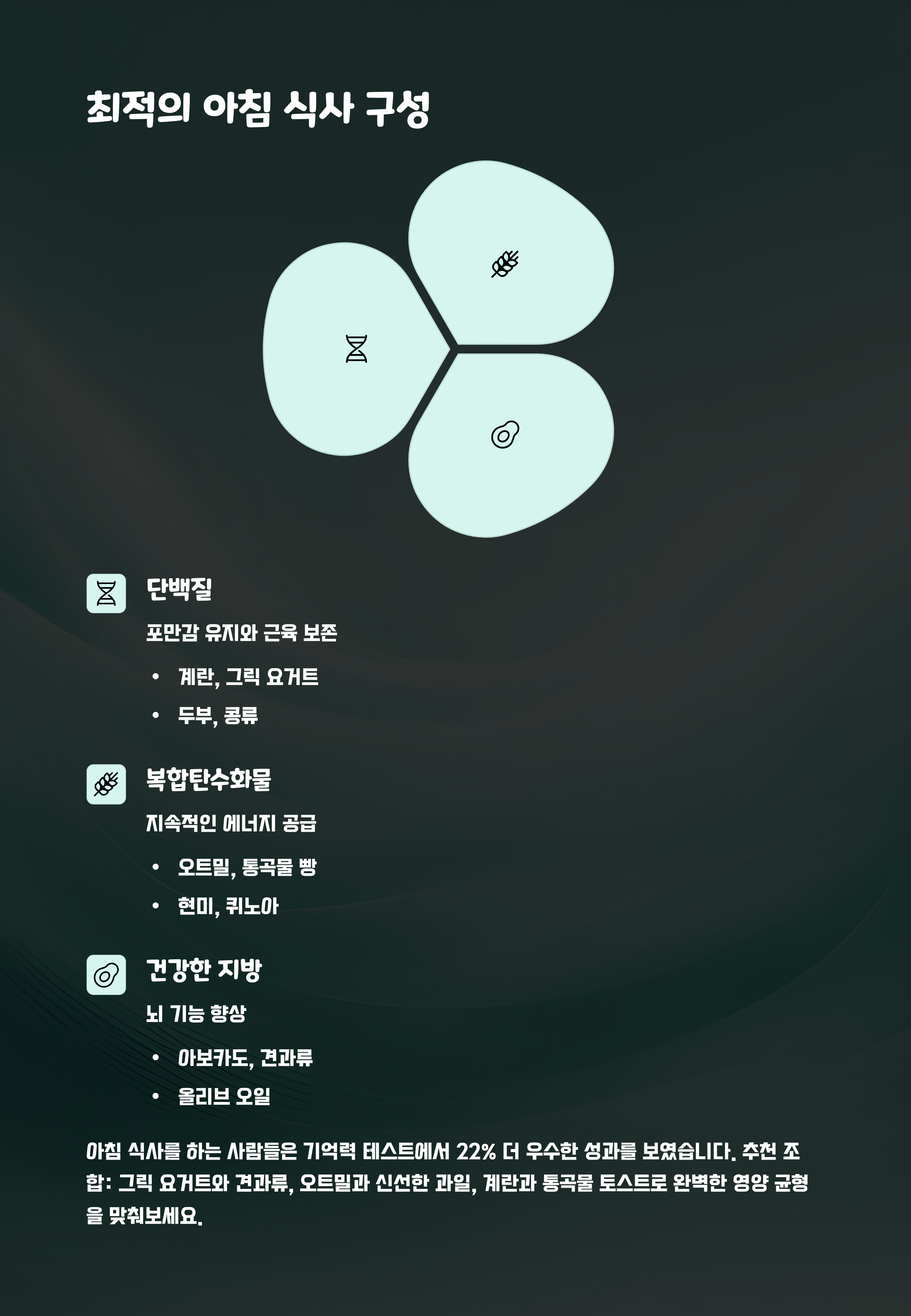 아침식사는 하루를 시작하는 중요한 요소입니다. 간단하면서도 영양가 높은 식사를 하면 오전 내내 에너지를 유지할 수 있습니다. 오트밀, 스크램블 에그, 통밀 토스트, 또는 과일 스무디와 같은 메뉴는 준비가 간편하면서도 영양소가 풍부합니다.