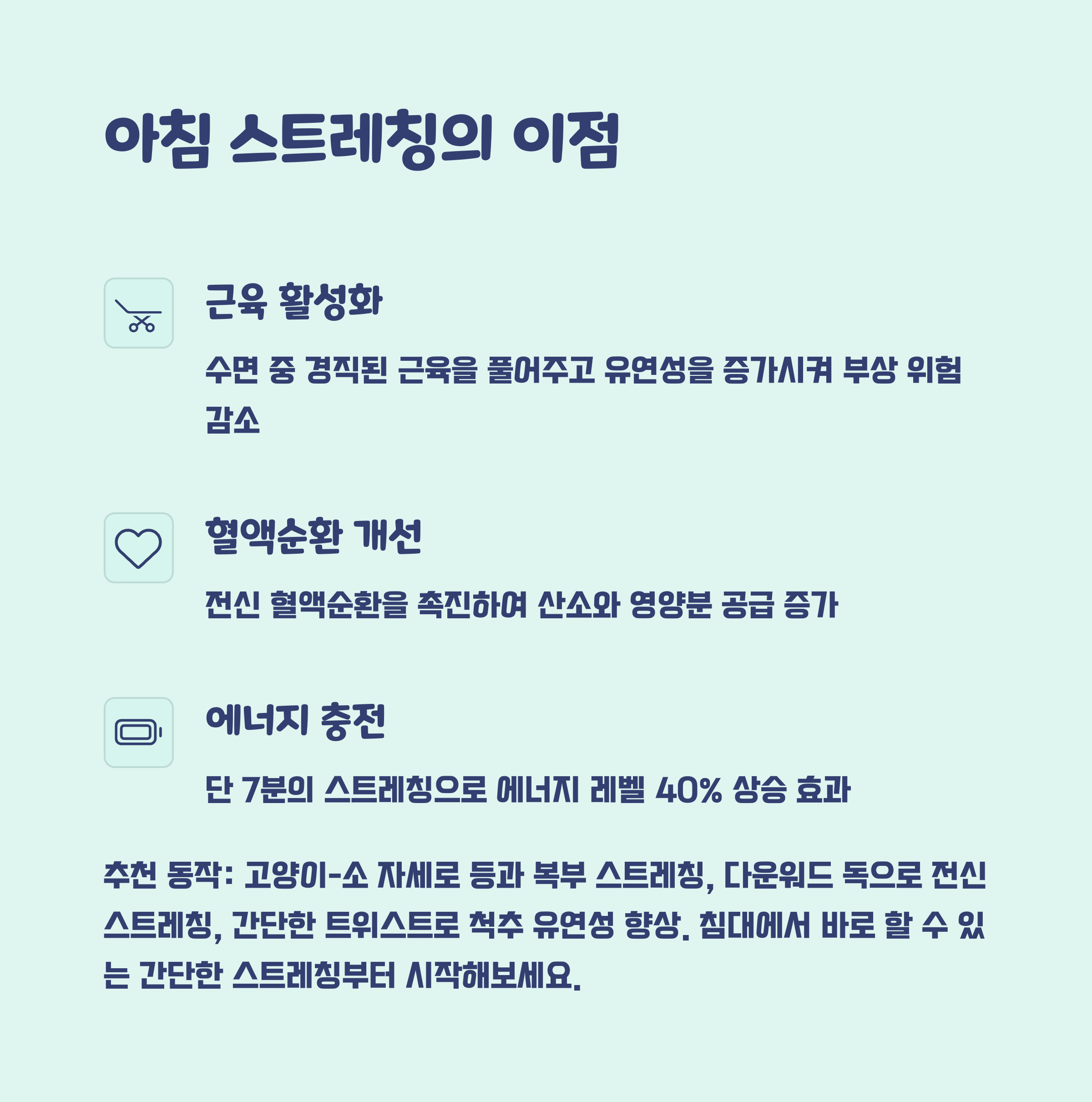 아침에는 밤사이 경직된 근육을 풀어주는 스트레칭이 중요합니다. 자리에서 기지개를 켜거나 간단한 요가 동작을 통해 몸의 긴장을 풀어보세요. 연구에 따르면 10~15분의 스트레칭이나 가벼운 운동은 에너지 수준을 높이고 집중력을 향상시키는 데 도움을 줍니다.