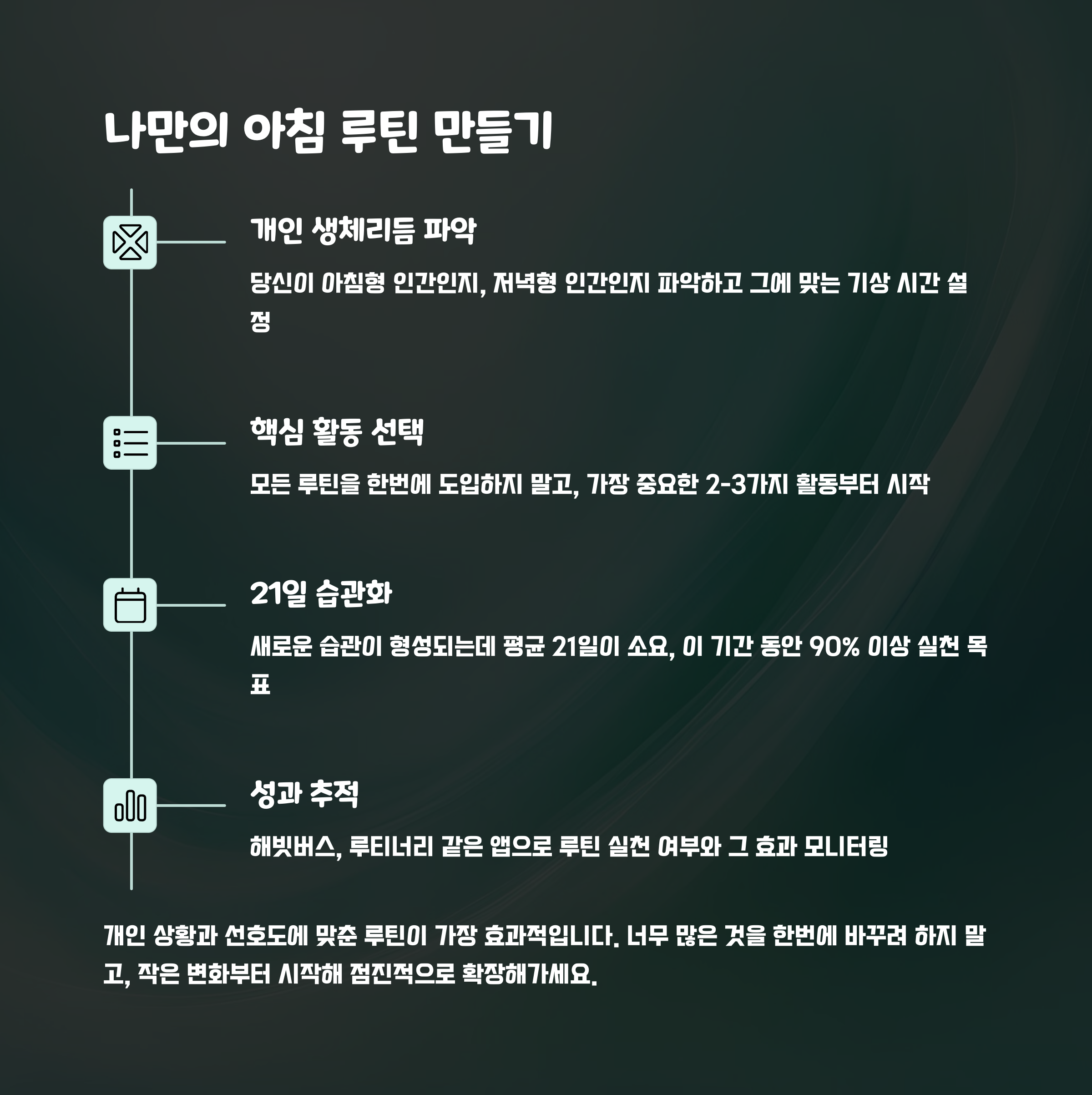 아침 루틴은 단순히 하루를 시작하는 습관이 아니라 삶 전체를 바꿀 수 있는 강력한 도구입니다. 위에서 소개한 방법들을 조합해 자신만의 루틴을 만들어보세요. 처음엔 작은 변화부터 시작하고 점차 확장하면 꾸준히 실천하기 쉬워집니다. 매일 아침, 물 한 잔과 명상, 스트레칭, 건강한 식사로 활기차게 하루를 열어보세요. 이러한 습관은 당신의 생산성과 행복감을 높여줄 것입니다!