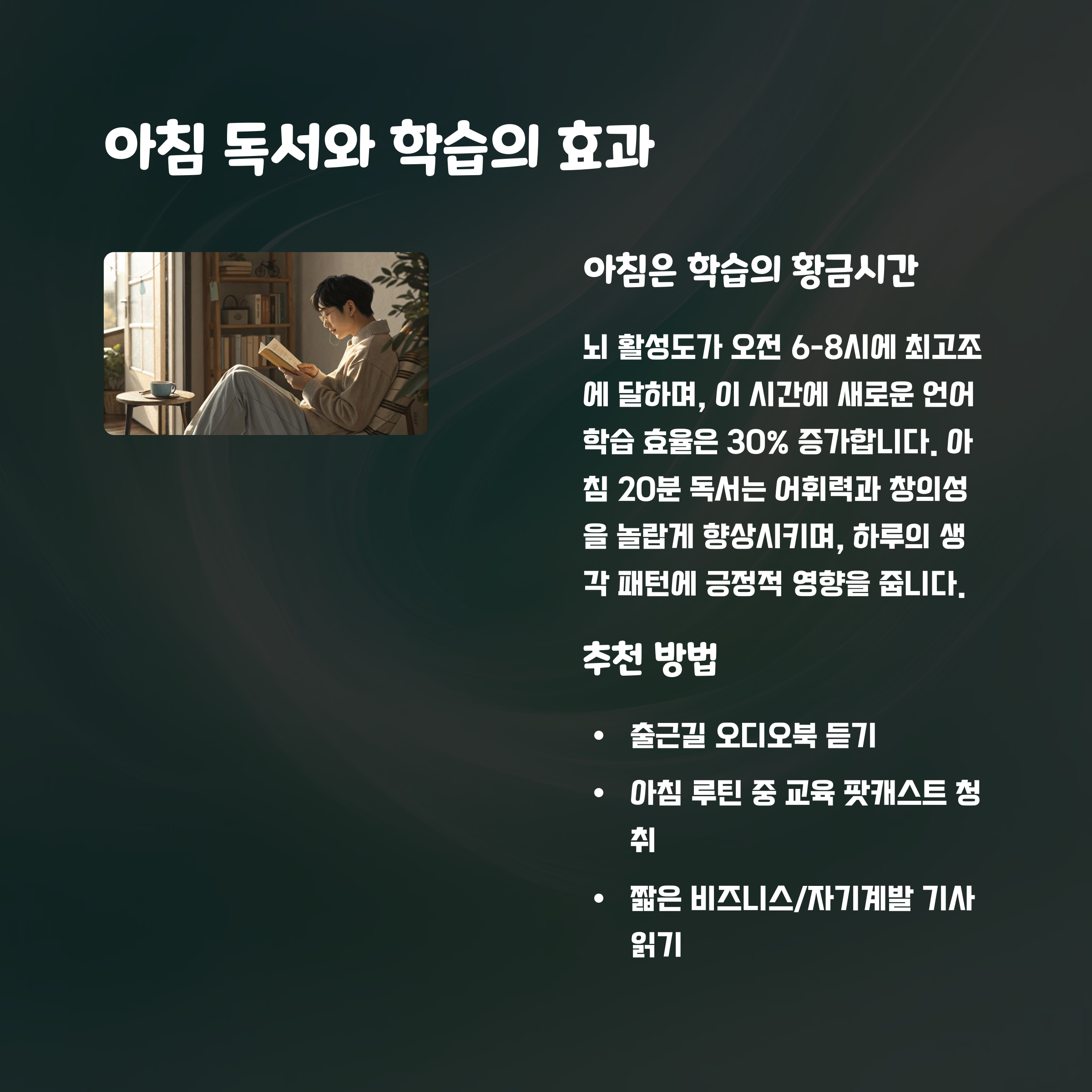 많은 성공한 사람들이 아침 시간을 독서나 학습에 활용합니다. 아침에는 방해 요소가 적고 정신이 맑아 집중력이 높아지는 시간이므로, 새로운 지식을 얻거나 중요한 정보를 습득하기에 이상적입니다.