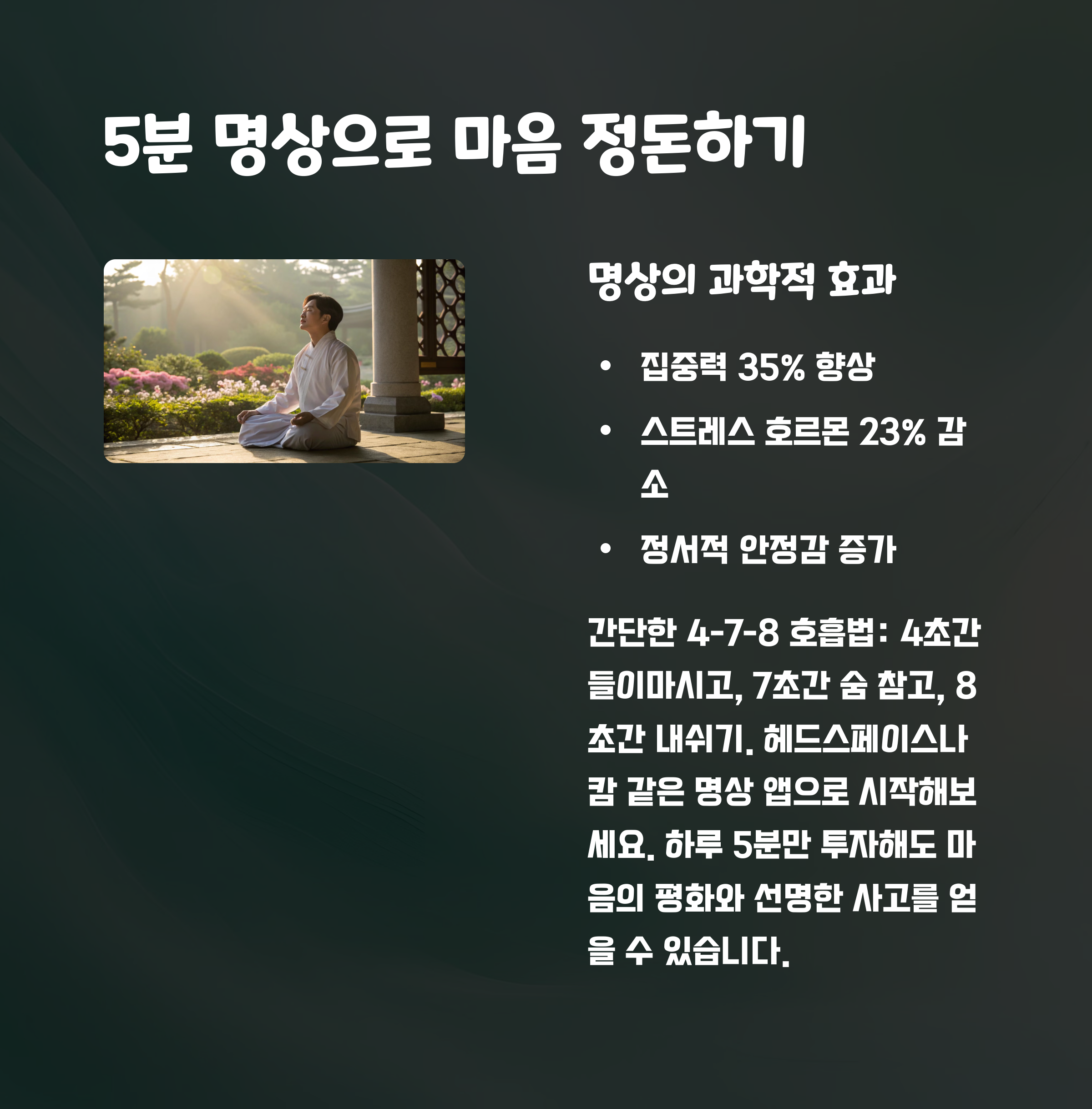 실천 방법 : 명상 앱이나 유튜브에서 가이드 명상을 활용하세요. 간단히 앉아서 심호흡하며 자신의 호흡에만 집중해보세요.
