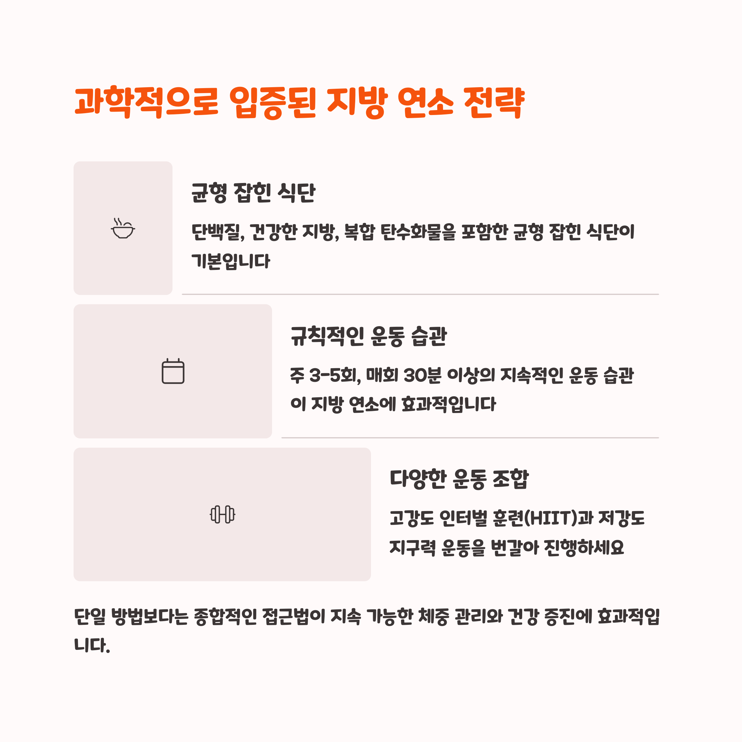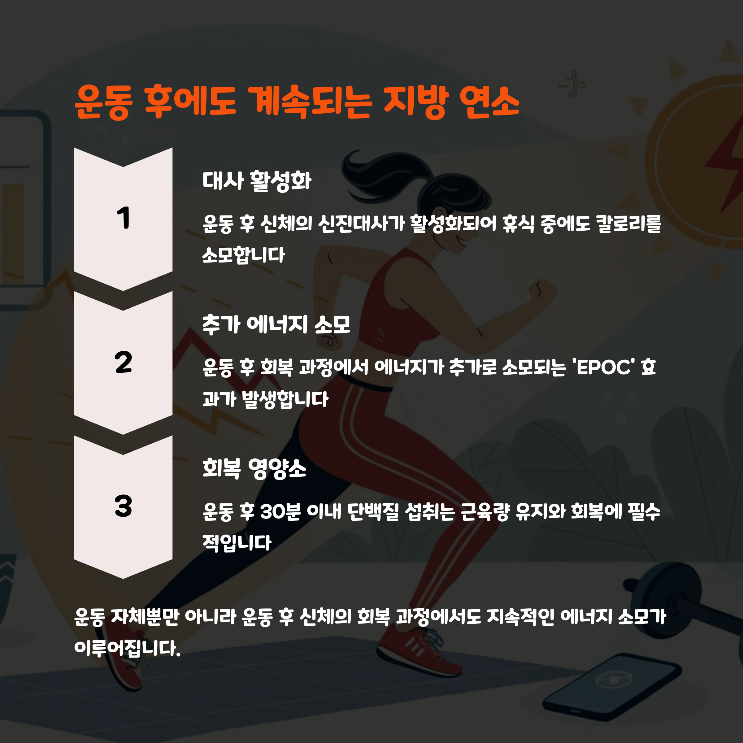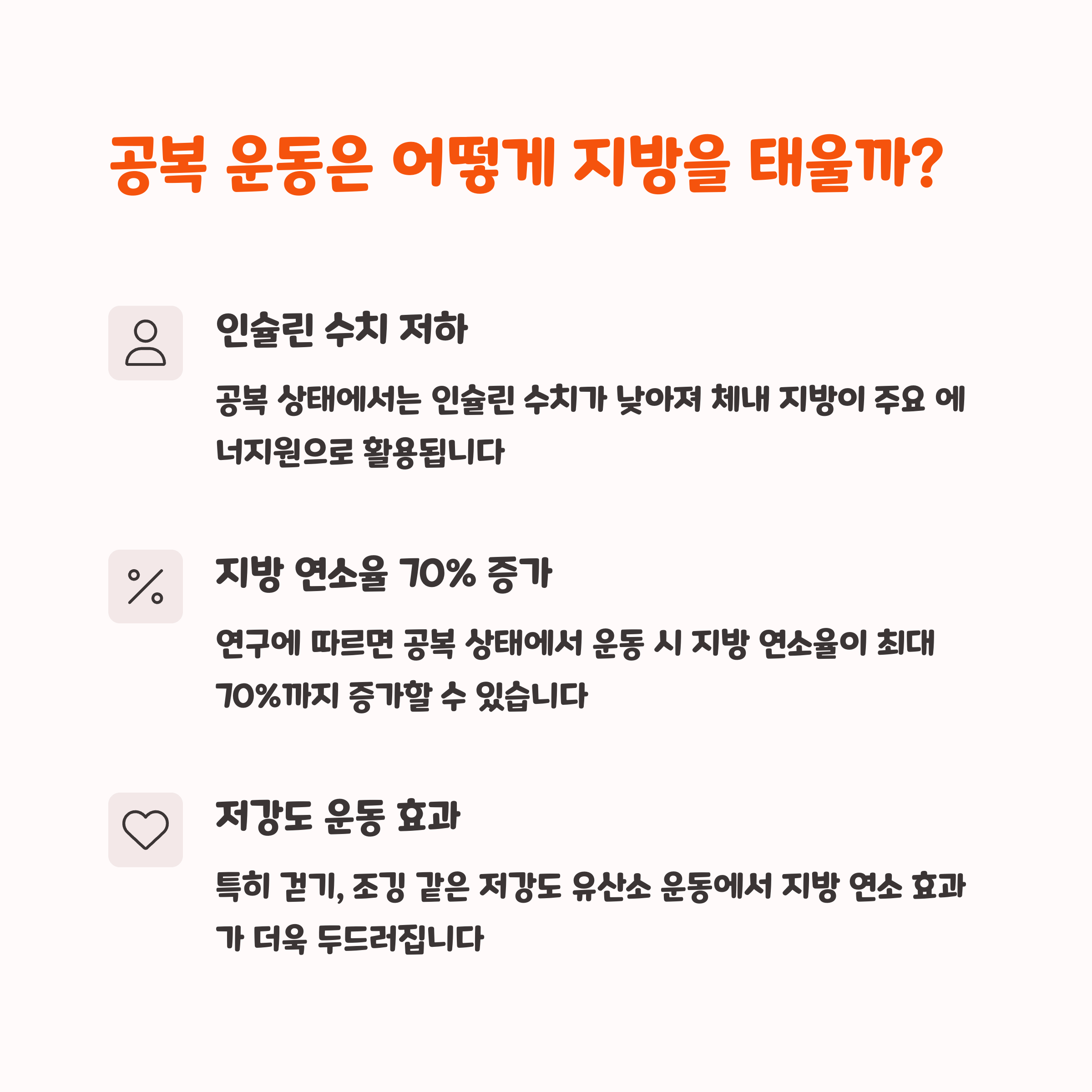 | 공복 운동의 핵심 | 공복 상태에서 지방을 주 에너지원으로 사용 |