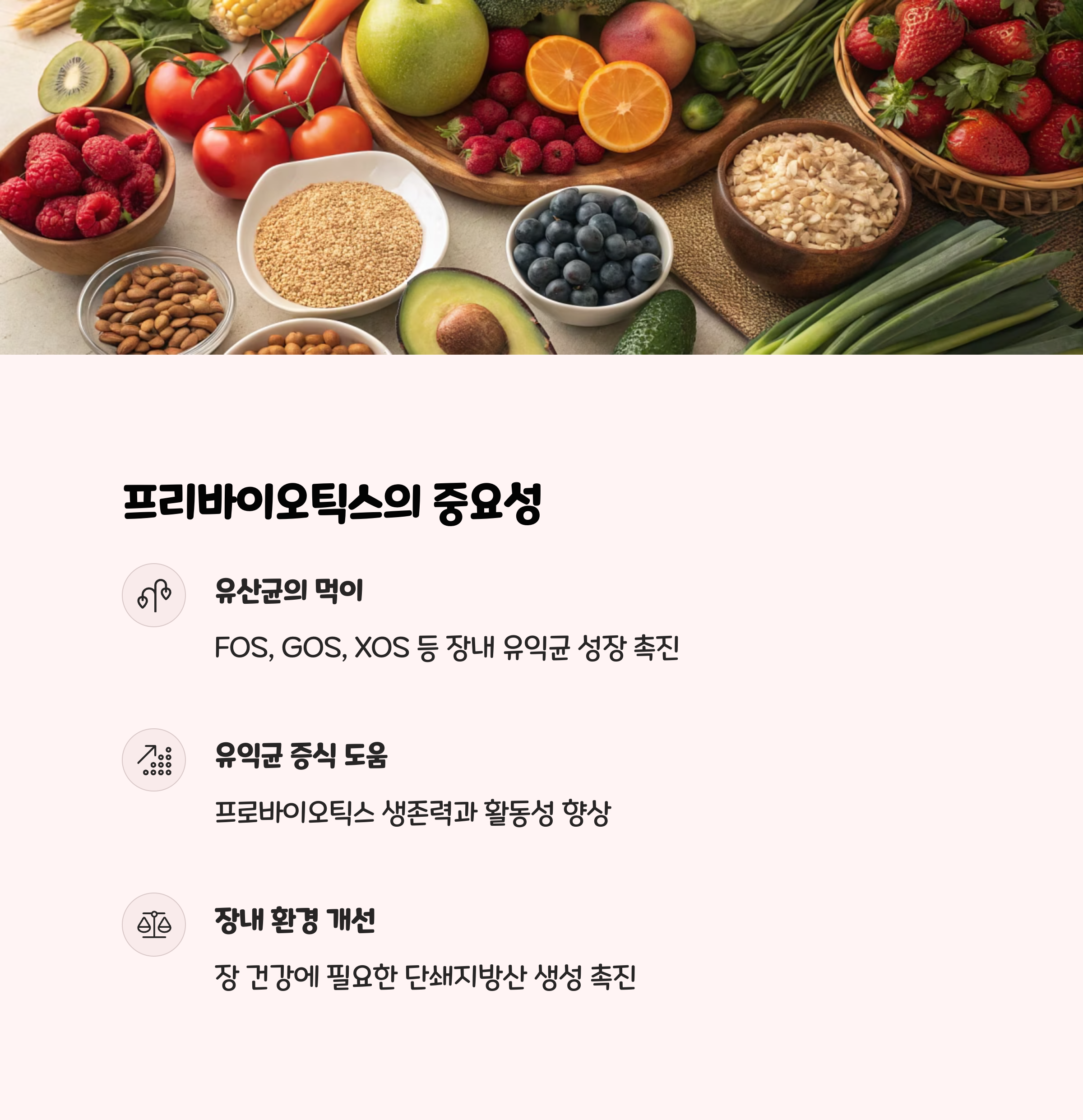 프리바이오틱스는 유산균의 먹이가 되는 성분으로, 대표적으로 FOS(프락토올리고당), GOS(갈락토올리고당) 등이 있습니다. 유산균이 장에서 잘 증식하고 정착할 수 있도록 도와주며, 실제로 **프로바이오틱스와 프리바이오틱스를 함께 섭취(신바이오틱스)**하면 장 내 유익균 증식 효과가 더욱 커집니다.