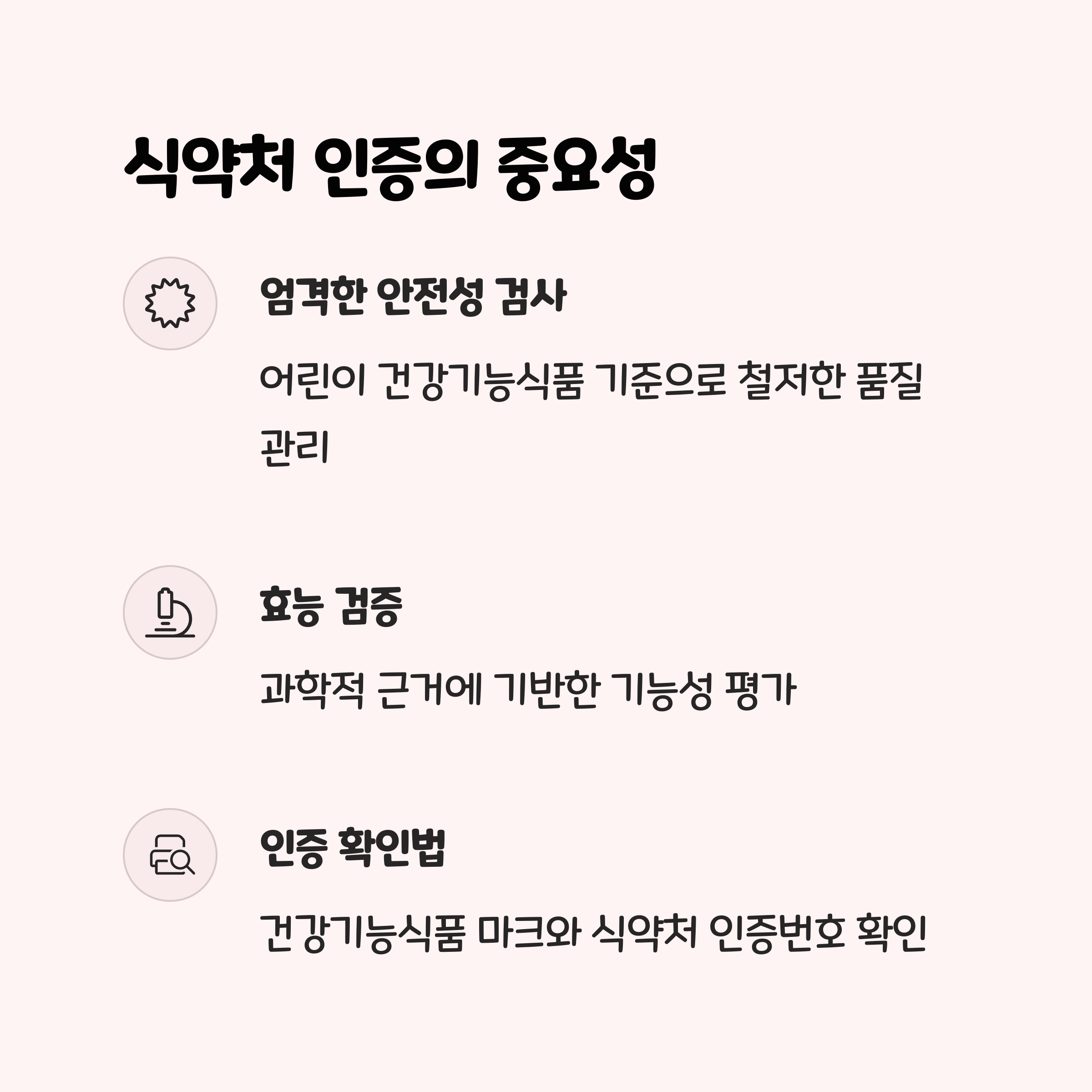 반드시 식약처 인증 ‘건강기능식품’ 마크가 있는지, 대장균군 및 이물 검출 시험을 통과했는지 확인하세요. 화학 부형제, 합성첨가물, 인공향료 등이 없는지 꼼꼼히 체크하는 것도 중요합니다.