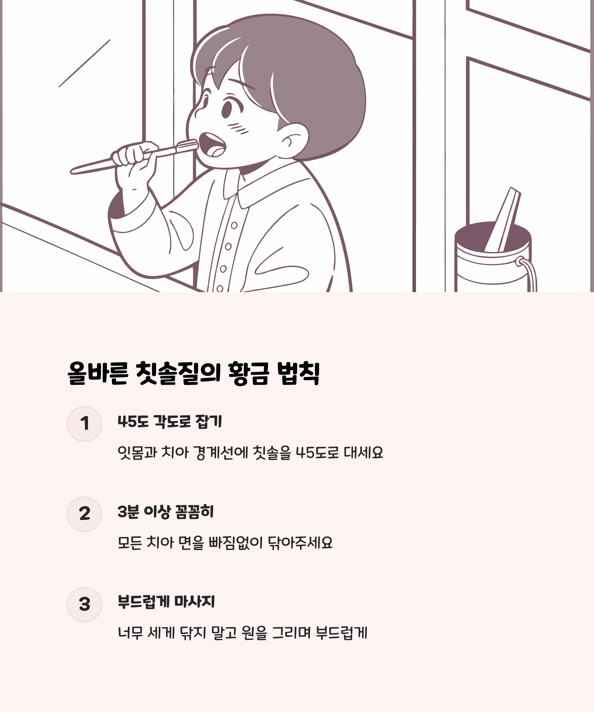 • 하루 최소 2회, 특히 잠자기 전 3분 이상 철저히 닦는 것이 중요합니다.
