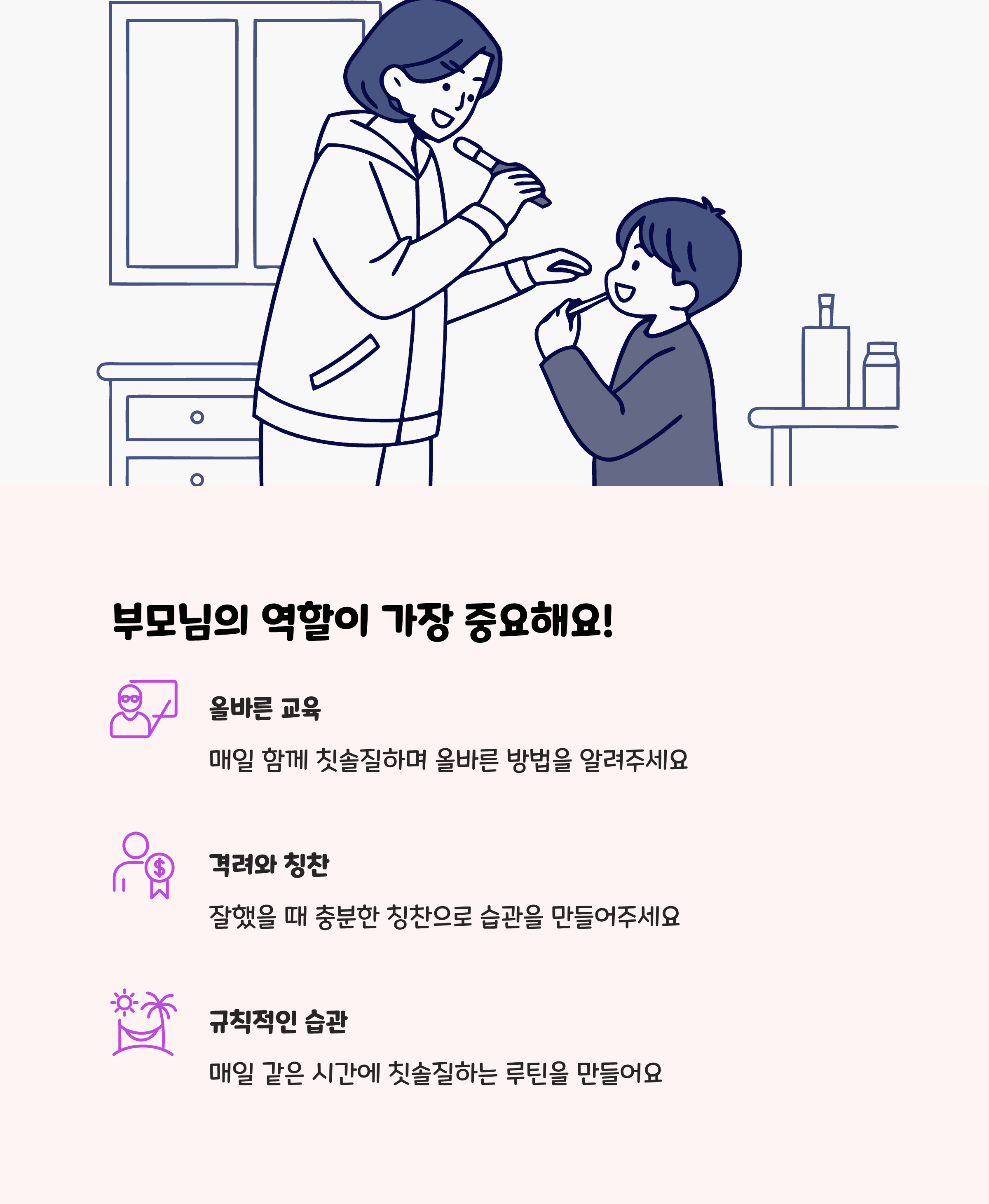 • 아이가 올바른 구강위생 습관을 자연스럽게 갖도록 부모가 모범을 보이며 감독하는 것이 효과적입니다.