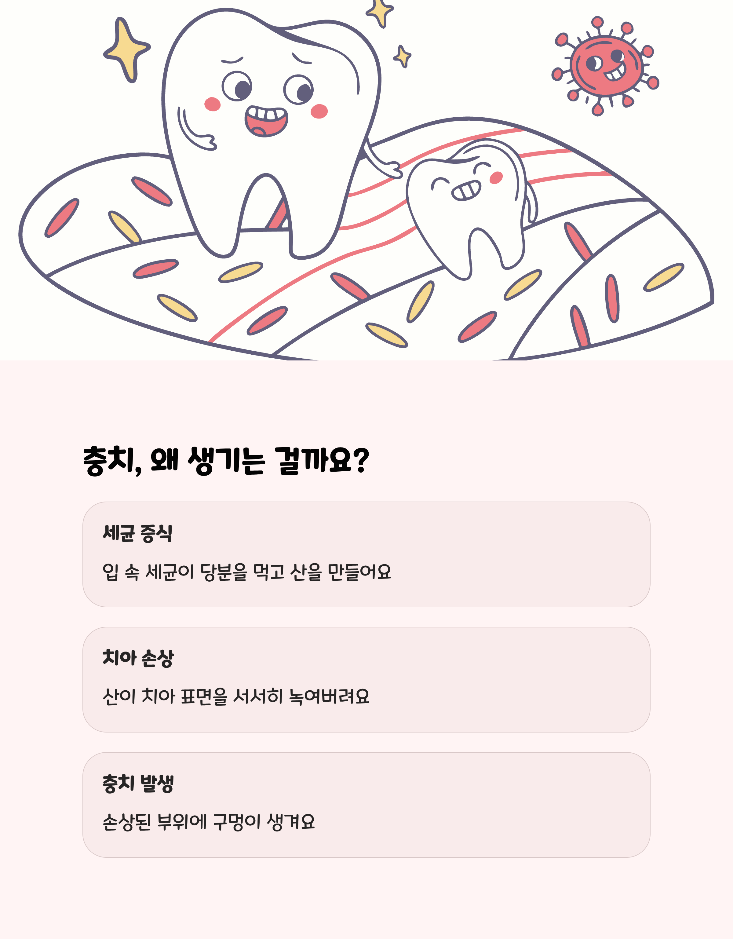 • 단순당이나 설탕 함량이 높은 간식과 음료(과자, 아이스크림, 탄산음료 등)는 충치 생성의 주원인입니다.