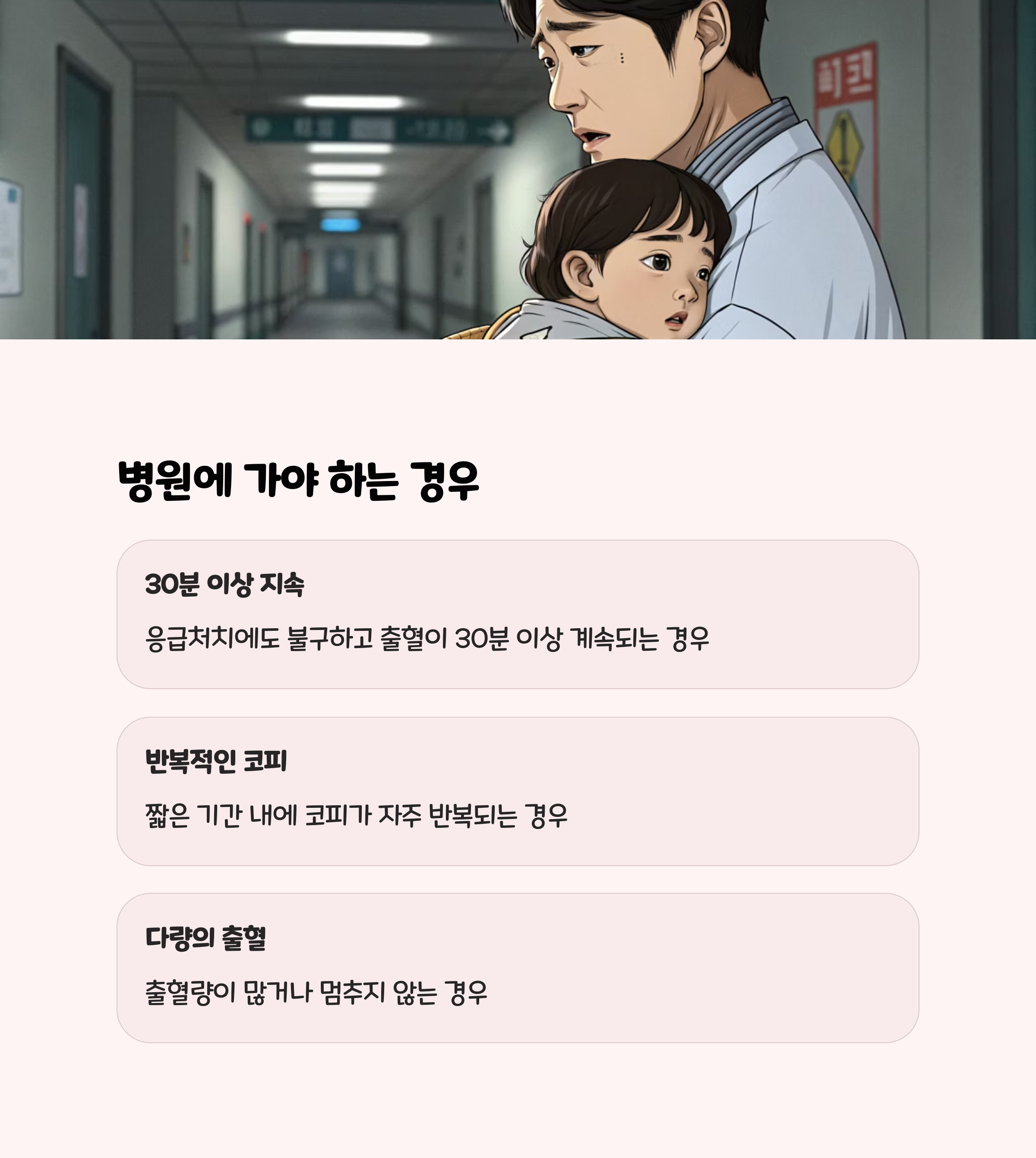 응급처치에도 불구하고 30분 이상 출혈이 지속되거나, 코피가 자주 반복된다면 반드시 병원에서 진단을 받아야 합니다. 혈액질환이나 다른 질병의 신호일 수 있기 때문입니다.
