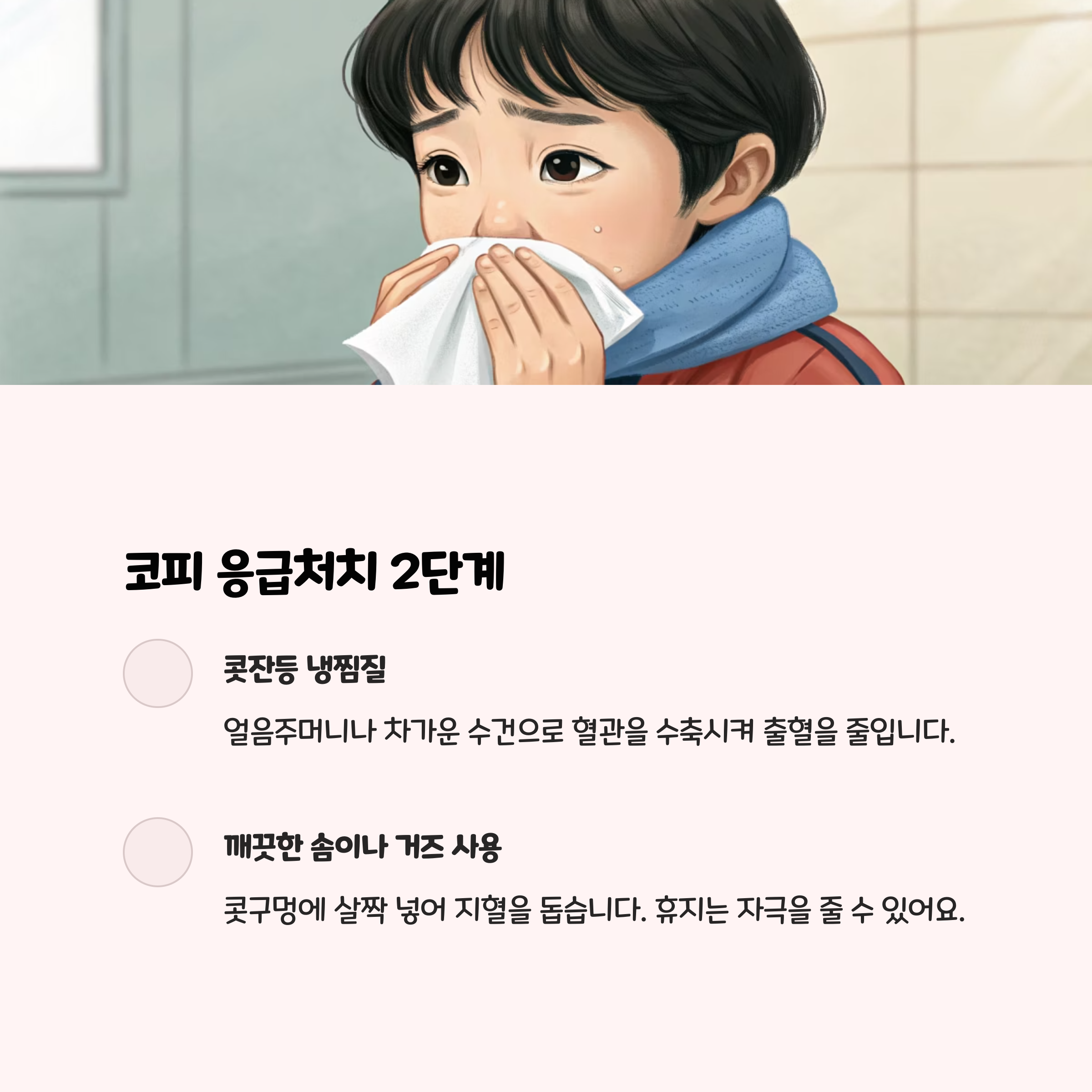 코피가 멈추지 않을 때는 얼음주머니나 차가운 수건을 콧잔등에 올려주면 혈관이 수축되어 출혈이 줄어듭니다.