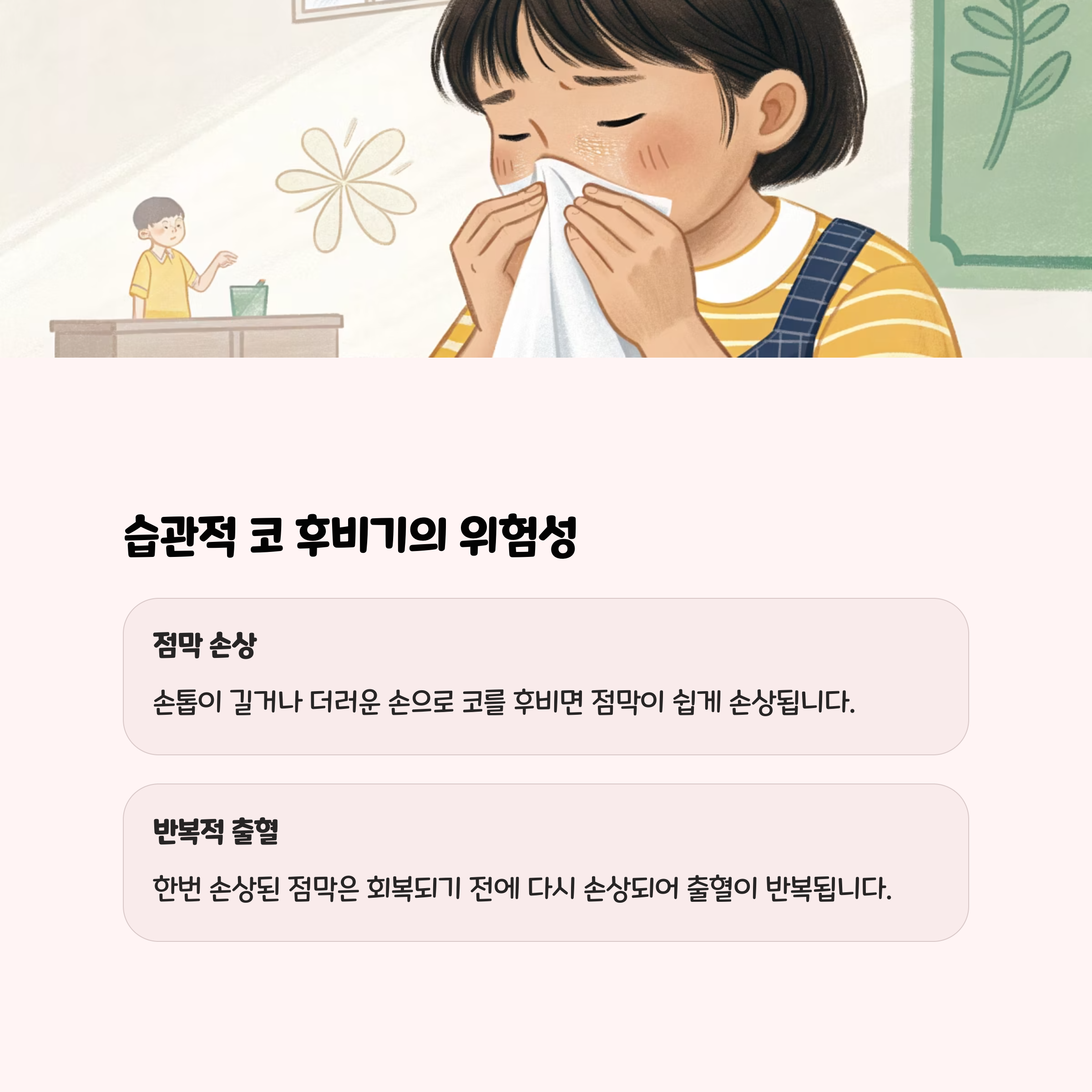 코를 자주 후비거나, 세게 푸는 습관도 주요 원인입니다. 손톱이 길거나 손이 깨끗하지 않을 때 코를 후비면 점막이 손상되어 출혈이 반복될 수 있습니다. 실제로 아이 코피의 대부분은 습관적 자극에서 비롯됩니다.