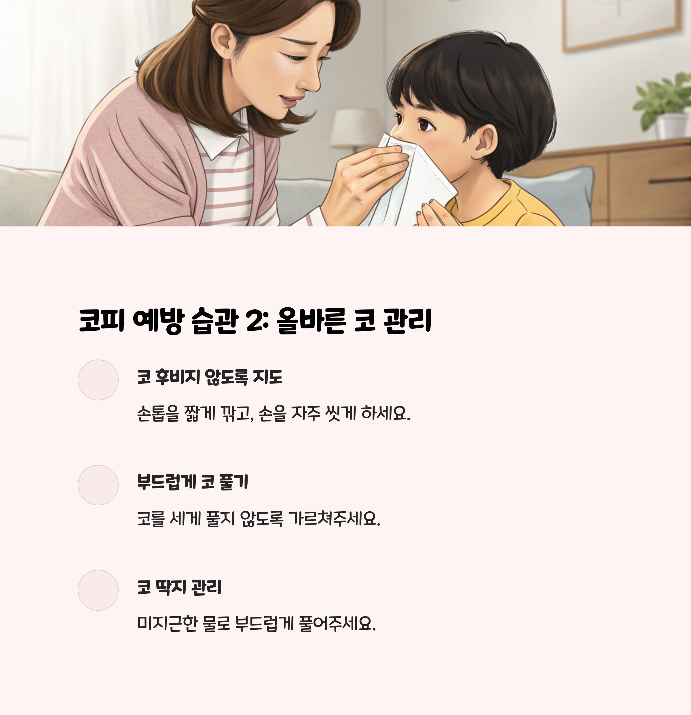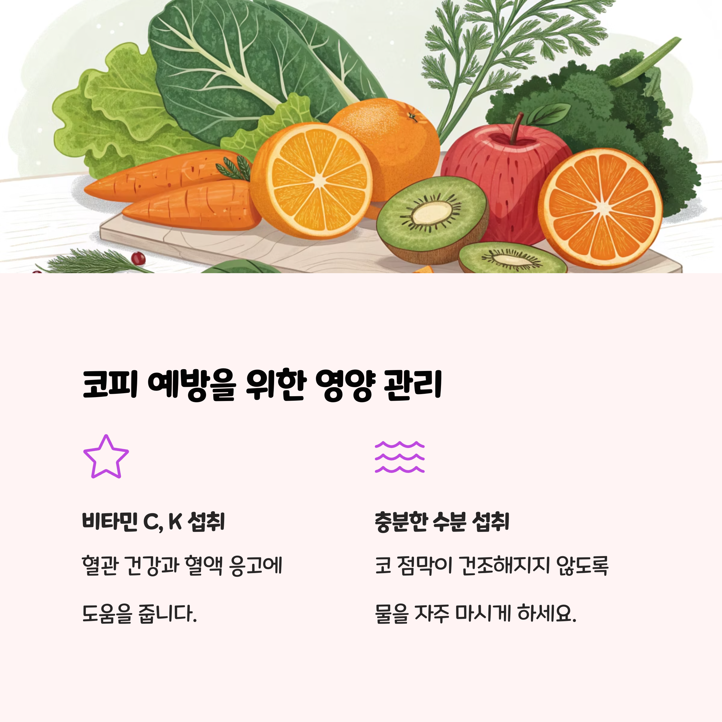 실내 습도 50~60% 유지: 가습기를 활용하거나 젖은 수건을 걸어두세요.코를 후비지 않도록 지도: 손톱을 짧게 깎고, 손을 자주 씻기게 하세요.코를 세게 풀지 않기: 감기 등으로 코딱지가 많을 때는 미지근한 물로 부드럽게 풀어주세요.비타민 C, K 풍부한 식단: 혈관 건강과 혈액 응고에 도움을 줍니다.충분한 수분 섭취와 휴식: 피로와 스트레스도 코피의 원인이 될 수 있습니다.