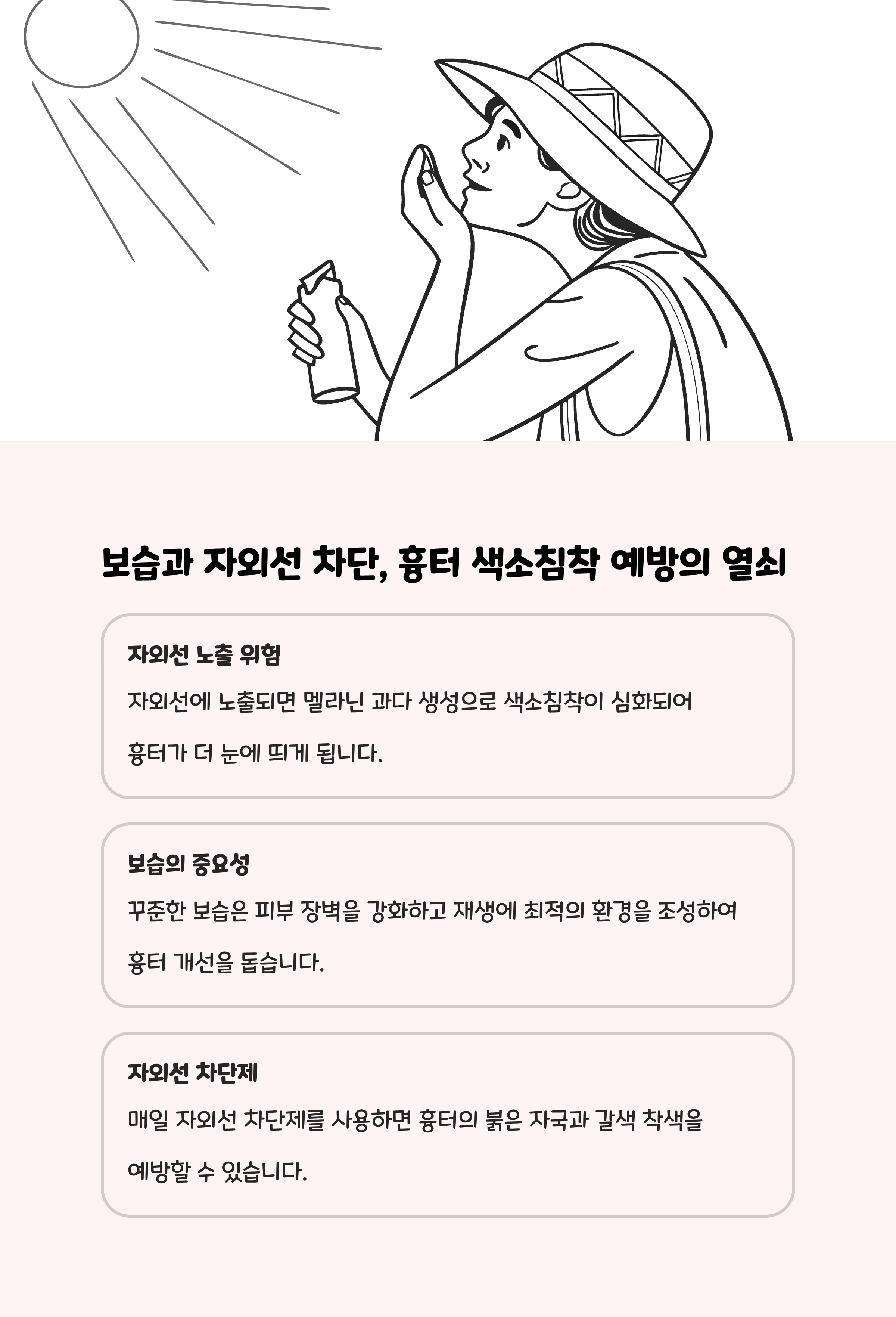 - 자외선 차단제를 매일 발라주면 흉터 부위의 색소침착 악화를 막을 수 있습니다.