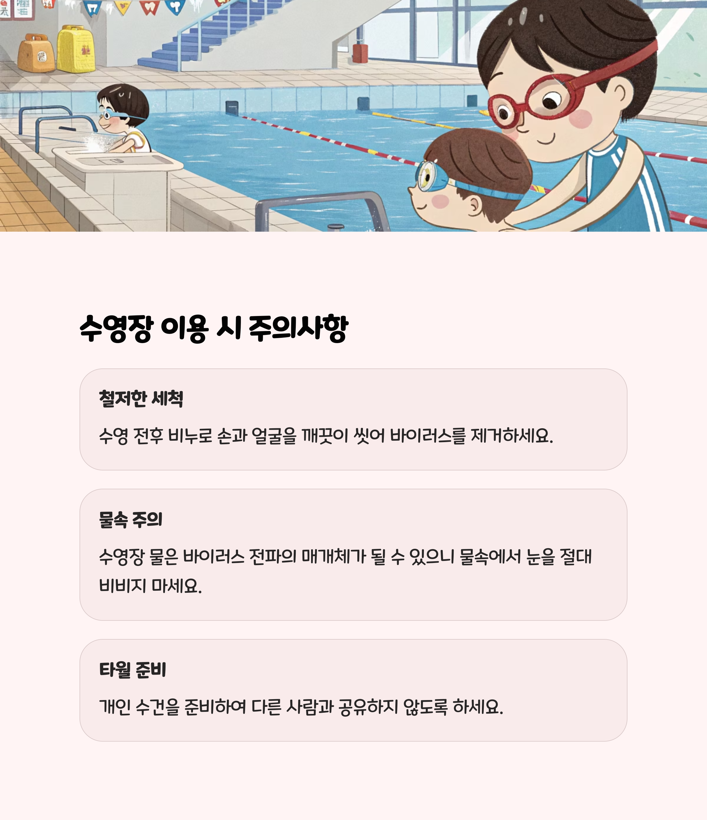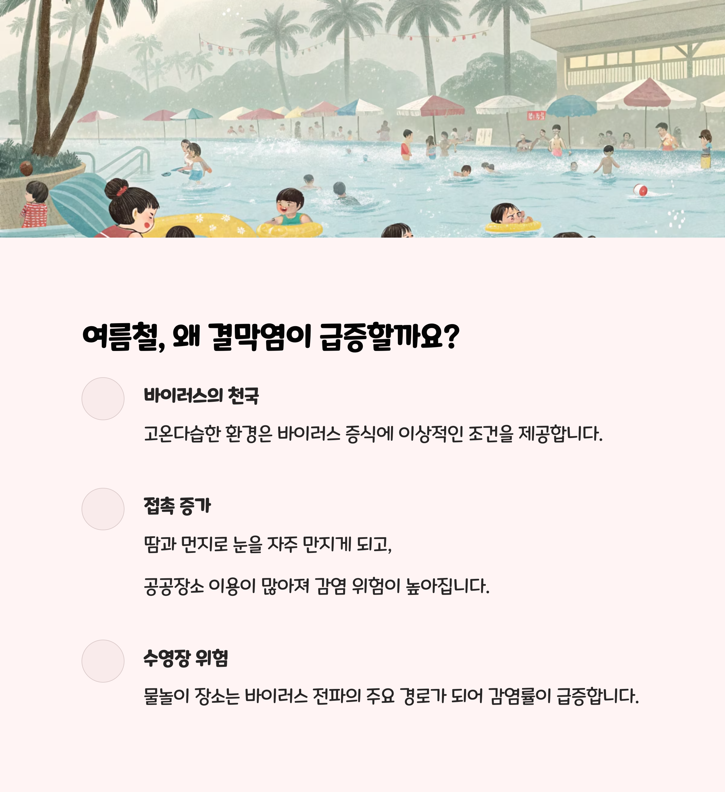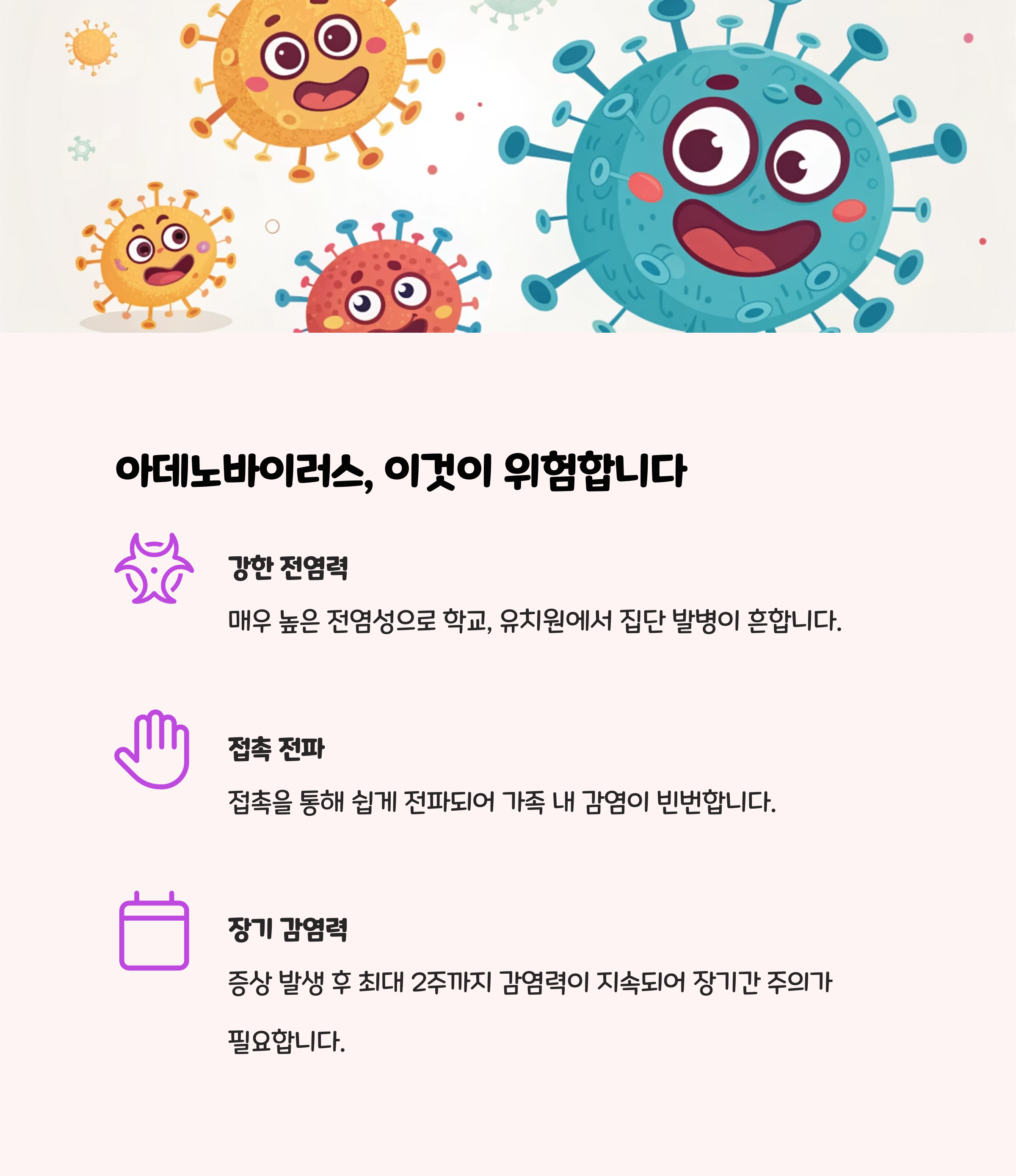 • 전염성이 매우 강해 수영장, 학교, 가정 등 집단생활 공간에서 쉽게 퍼집니다.