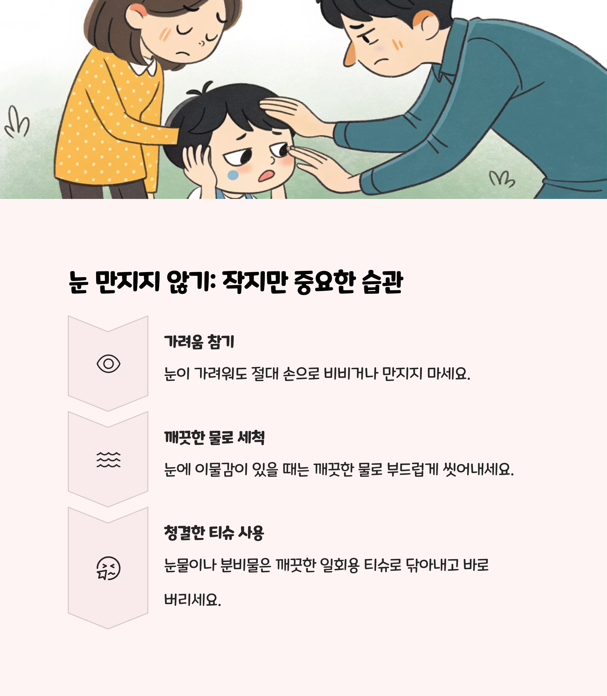 • 눈에 이물감이 있어도 손으로 만지지 않기