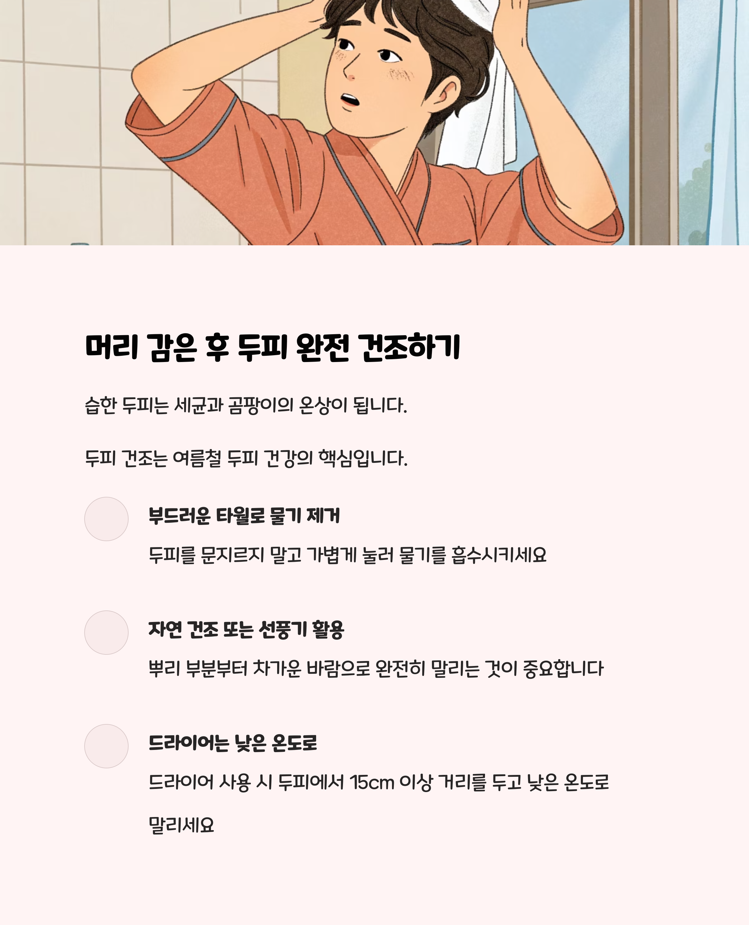 - 머리 감은 뒤 두피까지 완전히 말리기: 젖은 두피는 세균 번식의 온상이 되므로, 드라이어는 찬바람으로 사용하거나 자연 건조를 권장합니다.