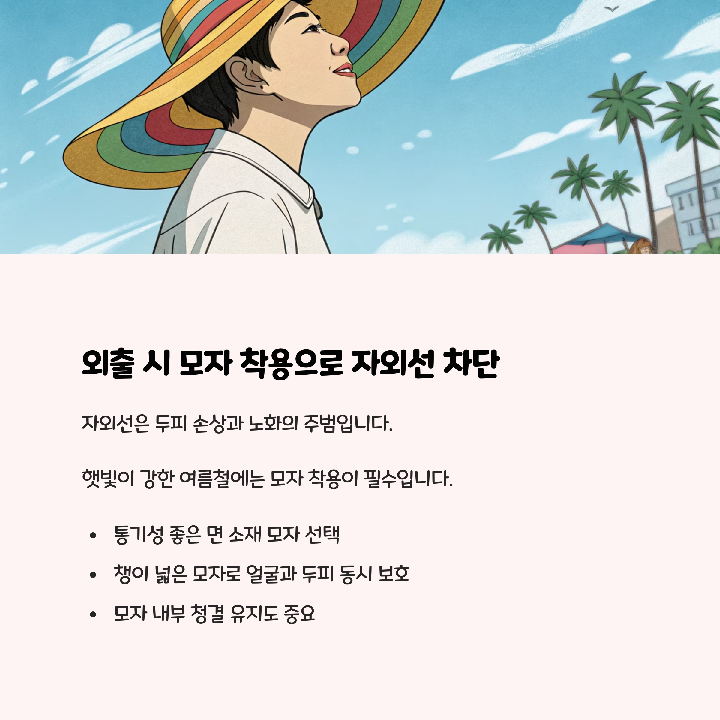 - 외출 시 모자 착용: 자외선으로부터 두피를 보호하고, 탈모 및 염증을 예방할 수 있습니다.