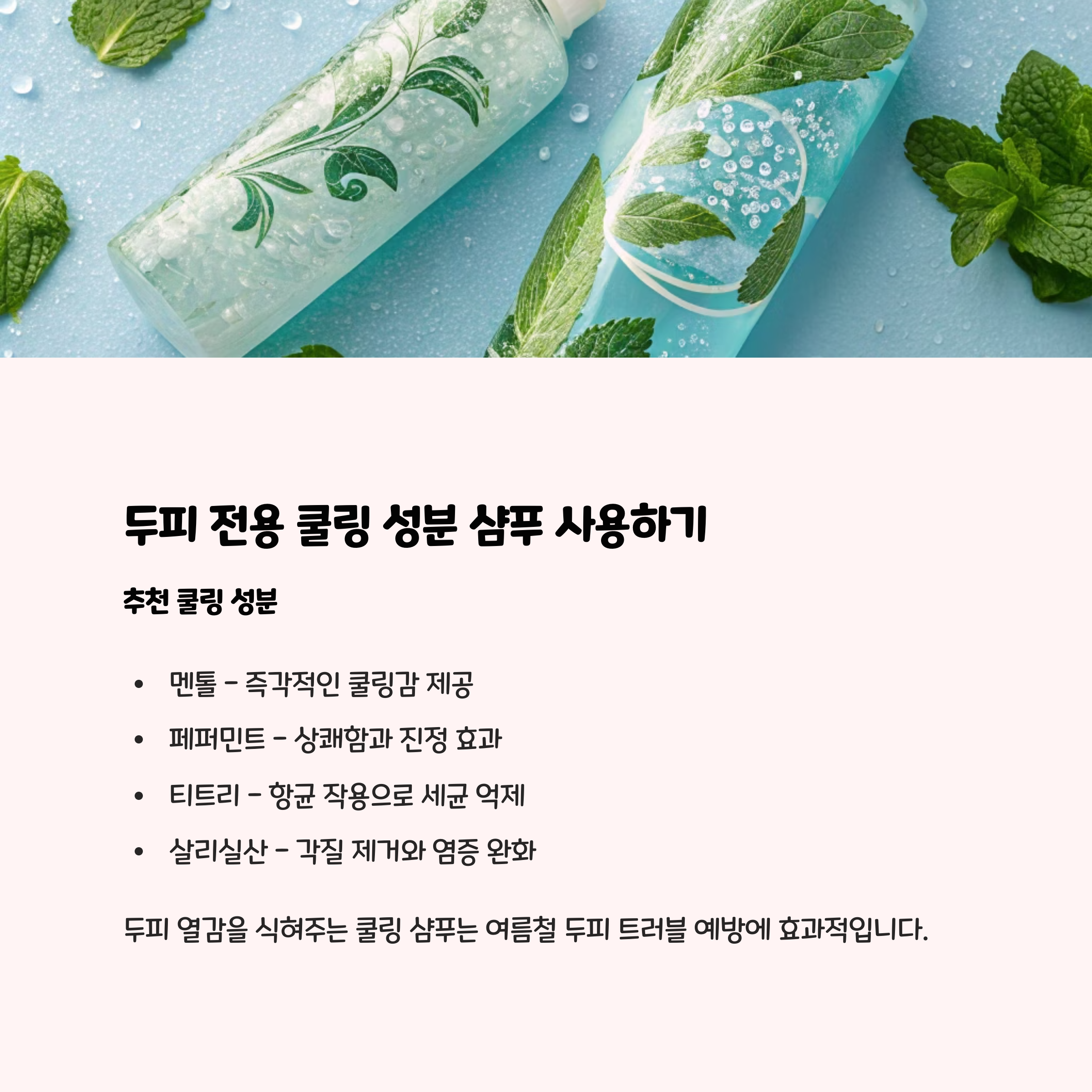 - 두피 전용 샴푸 사용: 멘톨, 티트리 등 쿨링 성분이 포함된 제품이 열감 완화에 효과적입니다.