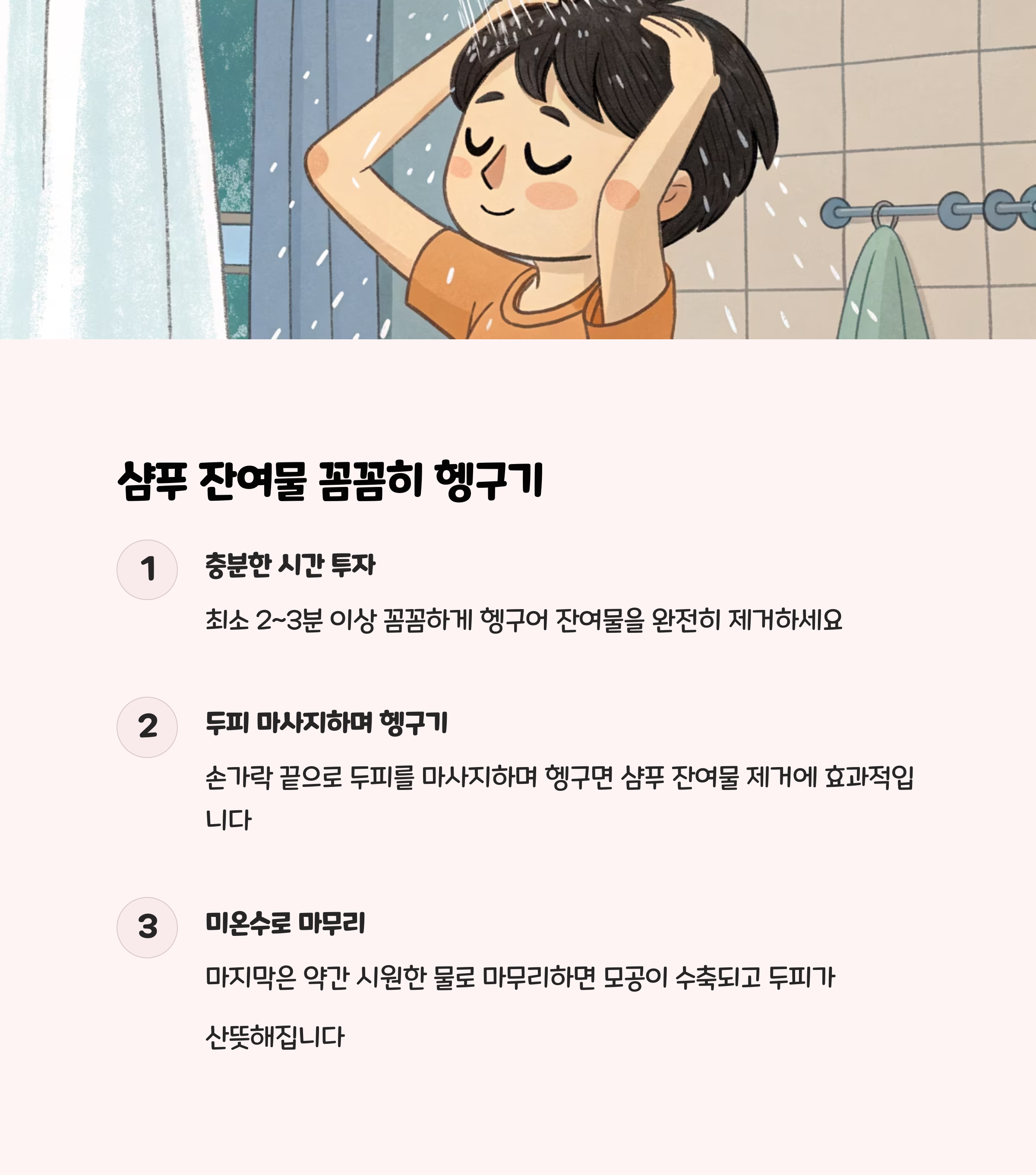 - 샴푸 잔여물 완벽히 제거: 잔여물이 남지 않도록 꼼꼼히 헹궈야 곰팡이 번식을 막을 수 있습니다.