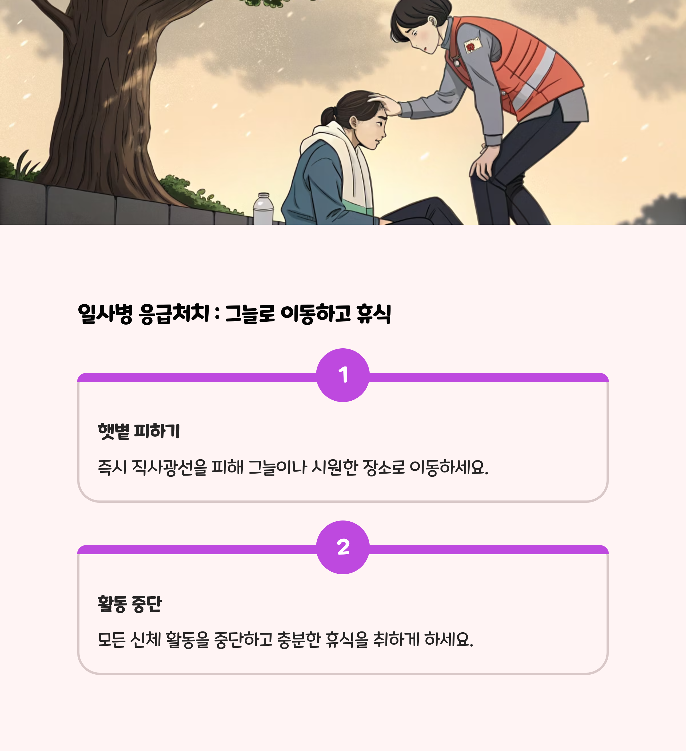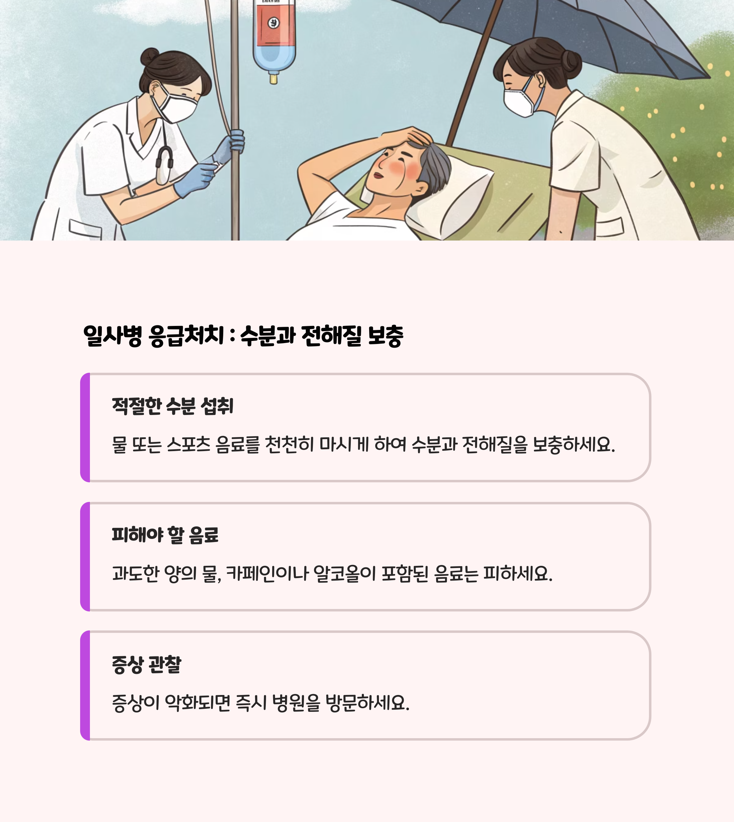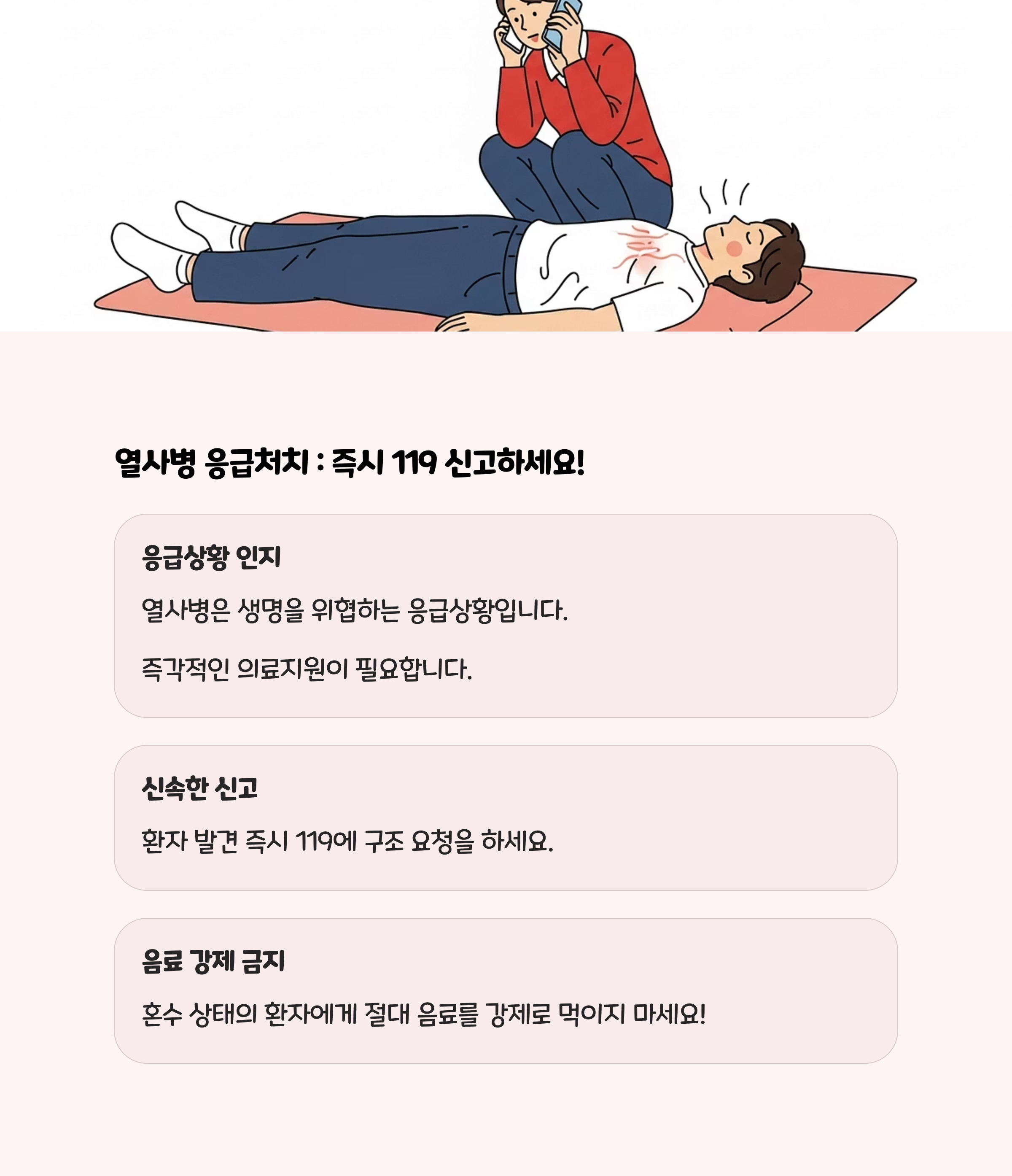 전해질이 포함된 음료(스포츠음료 등)를 마시게 하고, 찬물 샤워나 물수건으로 몸을 식혀줍니다.- 30분 이내 증상이 호전되지 않으면 병원으로 이동합니다.