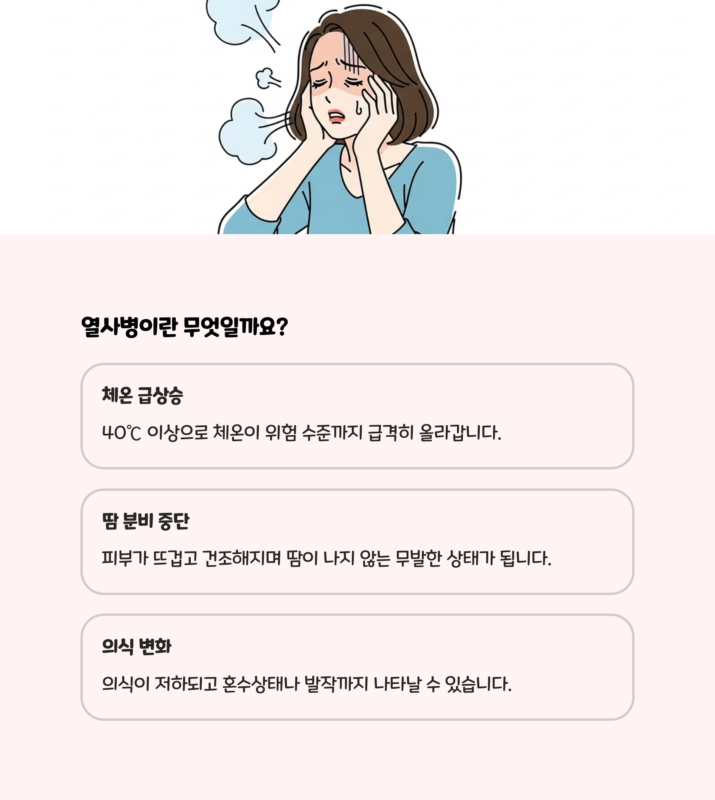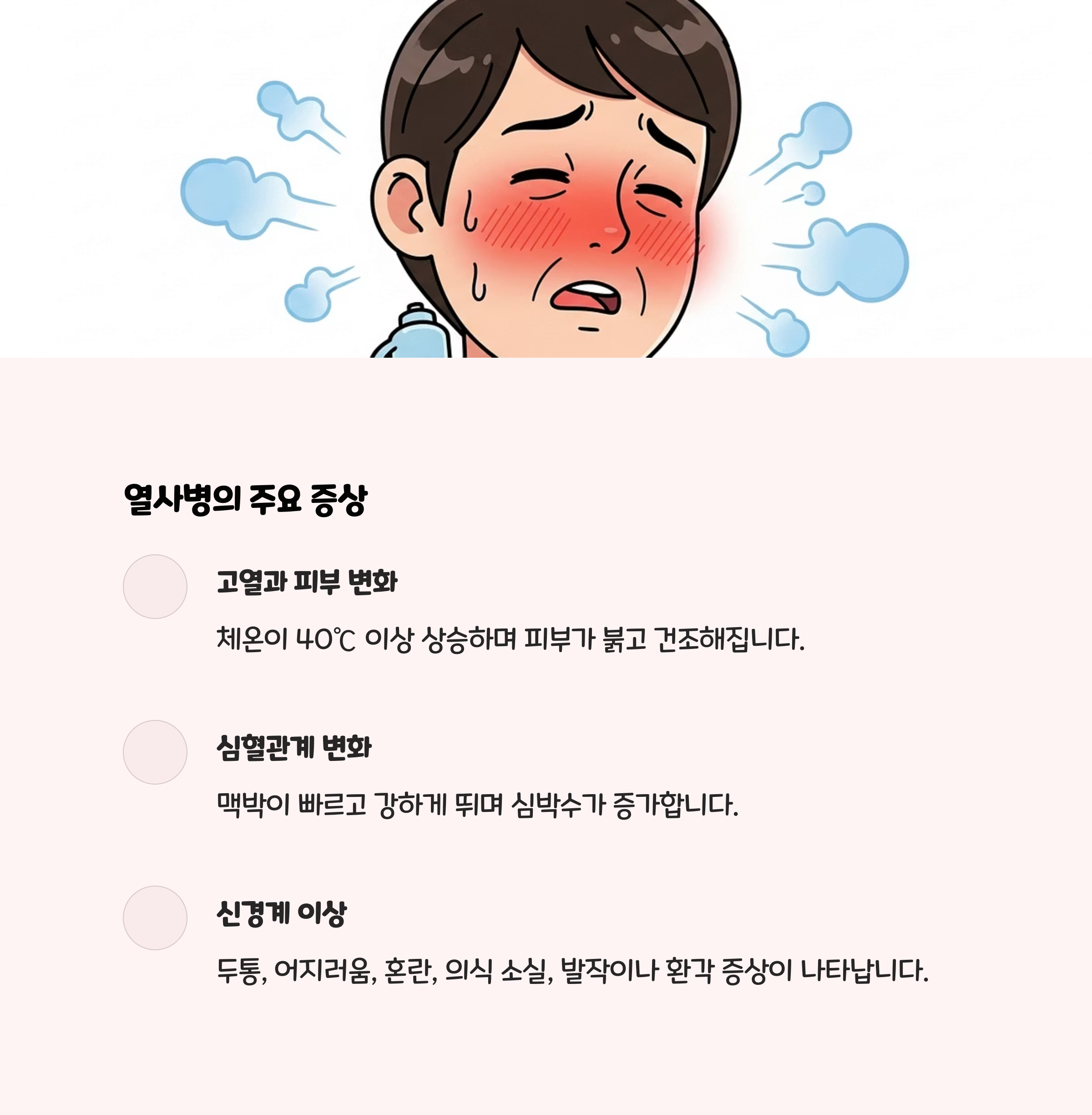 | 구분 | 체온 | 피부 상태 | 땀 분비 | 주요 증상 |