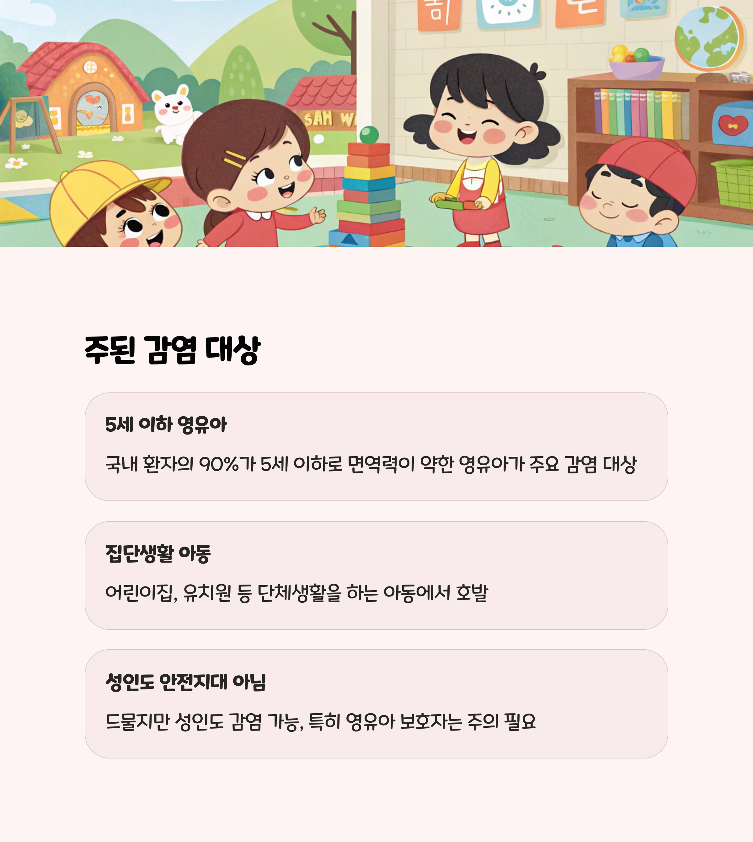 특히 어린이집, 유치원, 키즈카페 등 집단생활 공간에서 전파 위험이 높으며, 형제·자매 간 가족 내 감염도 흔하게 발생합니다.