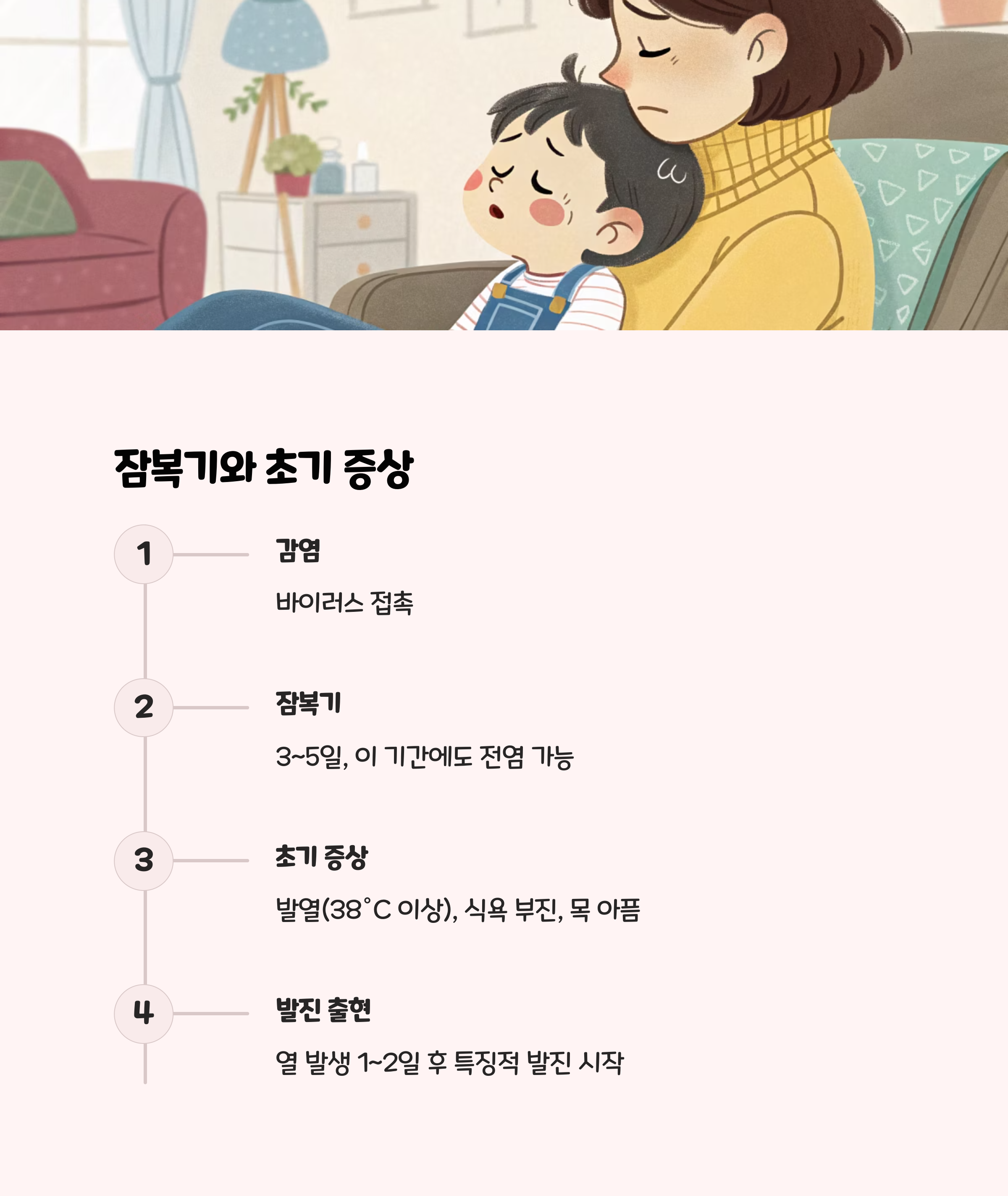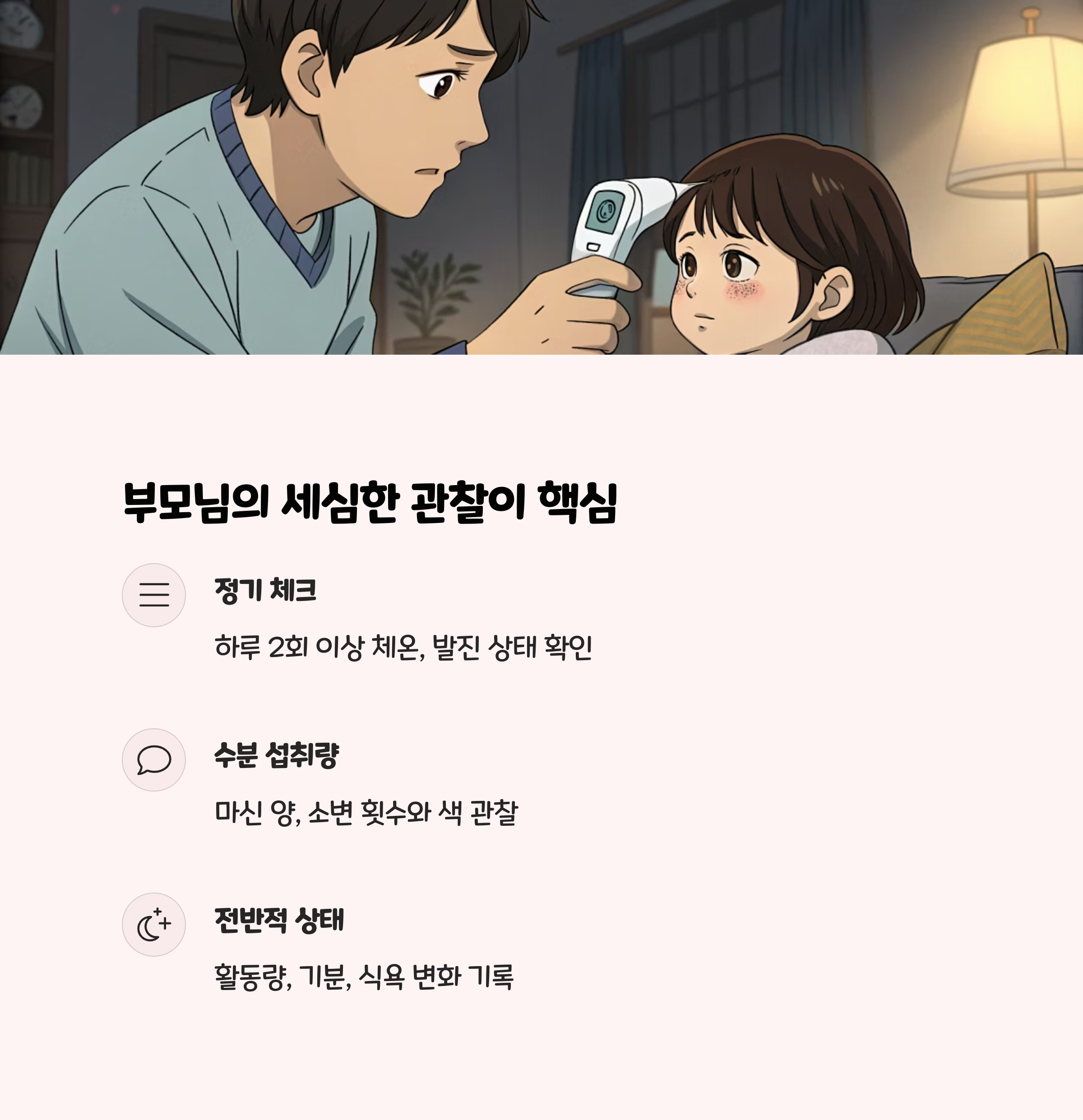 • 식욕 저하, 무기력, 인후통: 아이가 평소보다 축 처지고, 잘 먹지 않으며, 목이 아프다고 호소