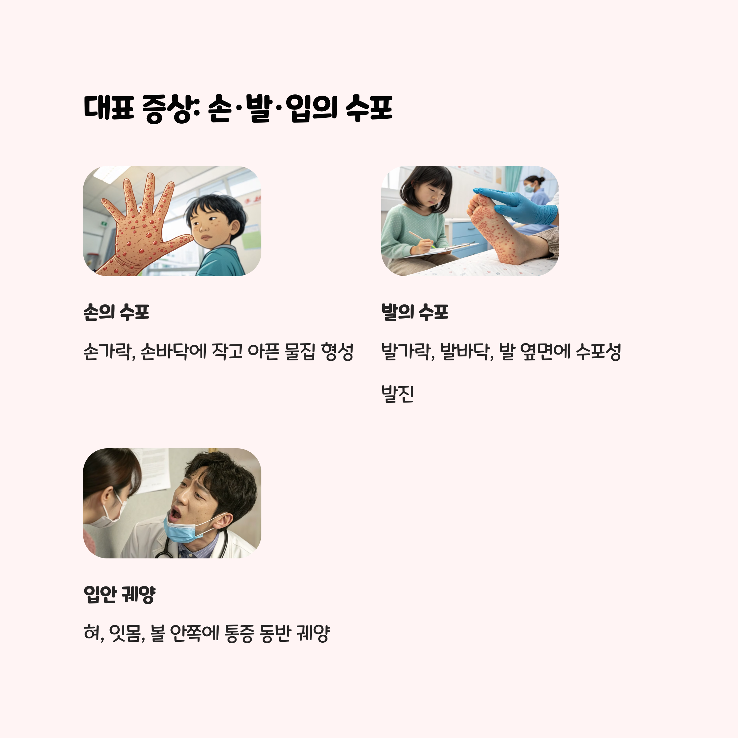 • 손·발·입안의 발진과 수포: 손바닥, 발바닥, 손가락, 발가락, 입안(혀, 볼, 잇몸, 입천장 등)에 작은 물집(수포)과 발진이 나타남.수포는 통증을 동반해 아이가 음식을 삼키기 힘들어함