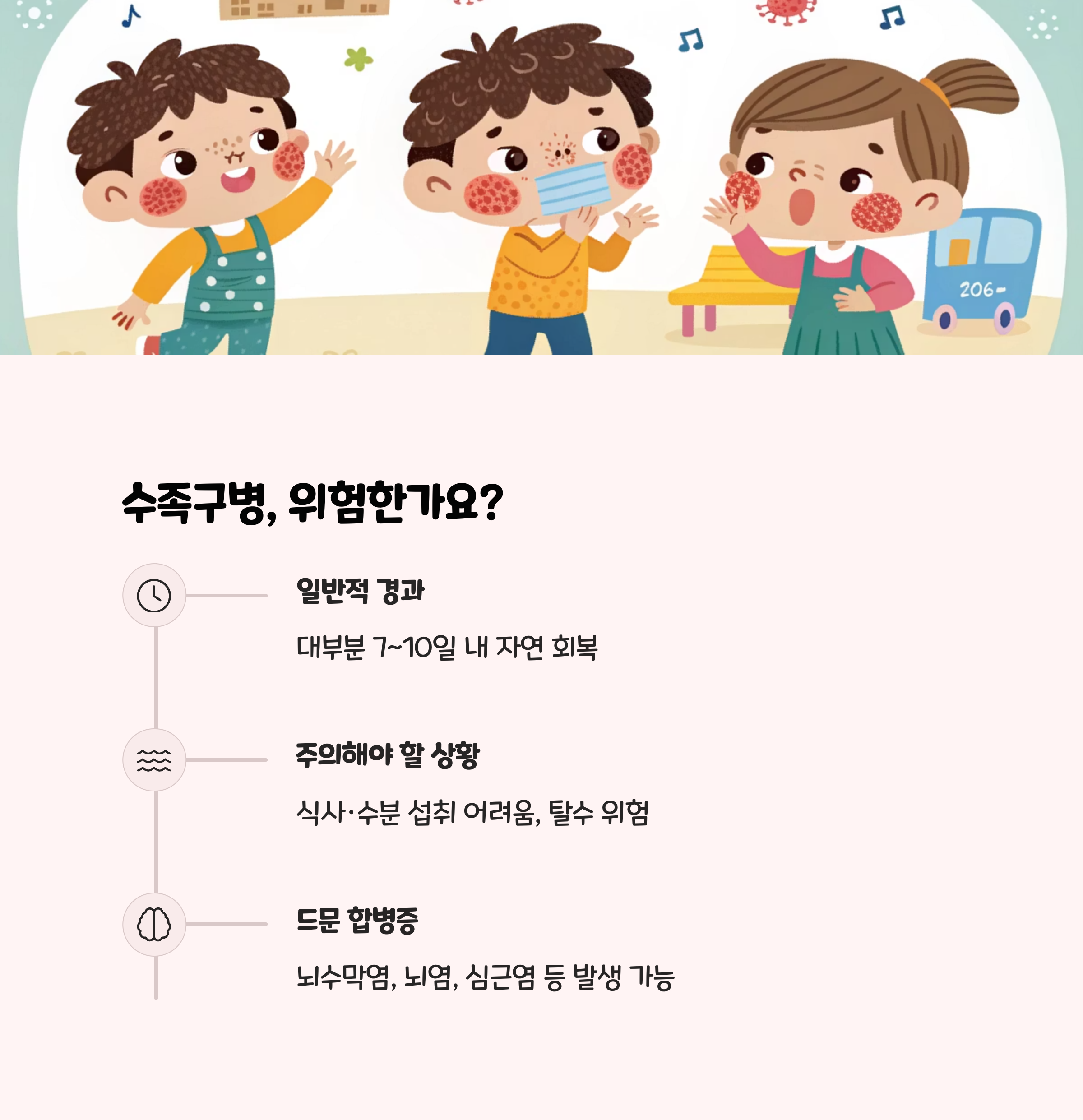 특히 엔테로바이러스 71형에 의한 감염은 드물게 뇌수막염, 심근염, 폐출혈 등 심각한 합병증을 유발할 수 있으니, 위와 같은 증상은 반드시 의료진의 진료를 받아야 합니다.