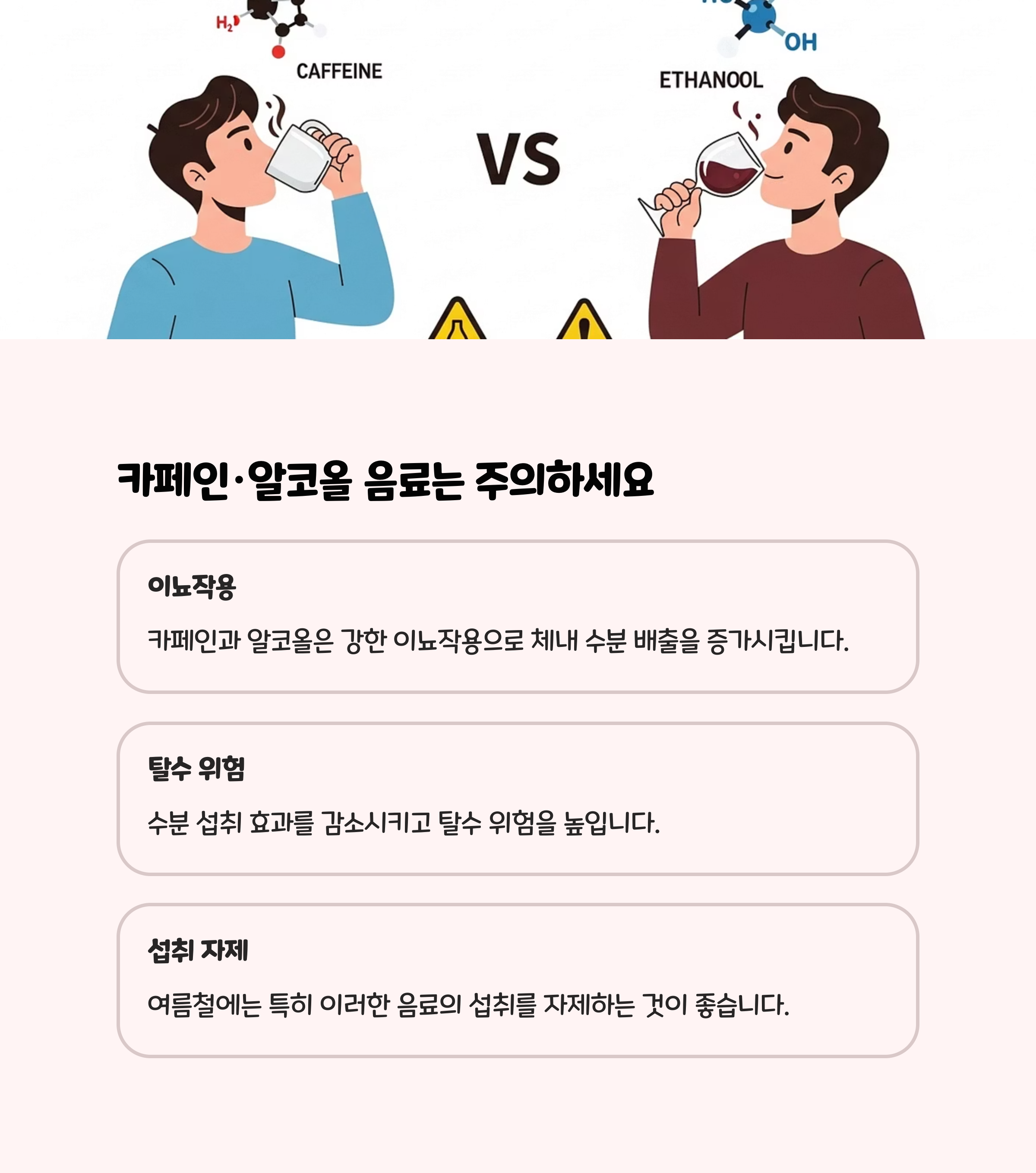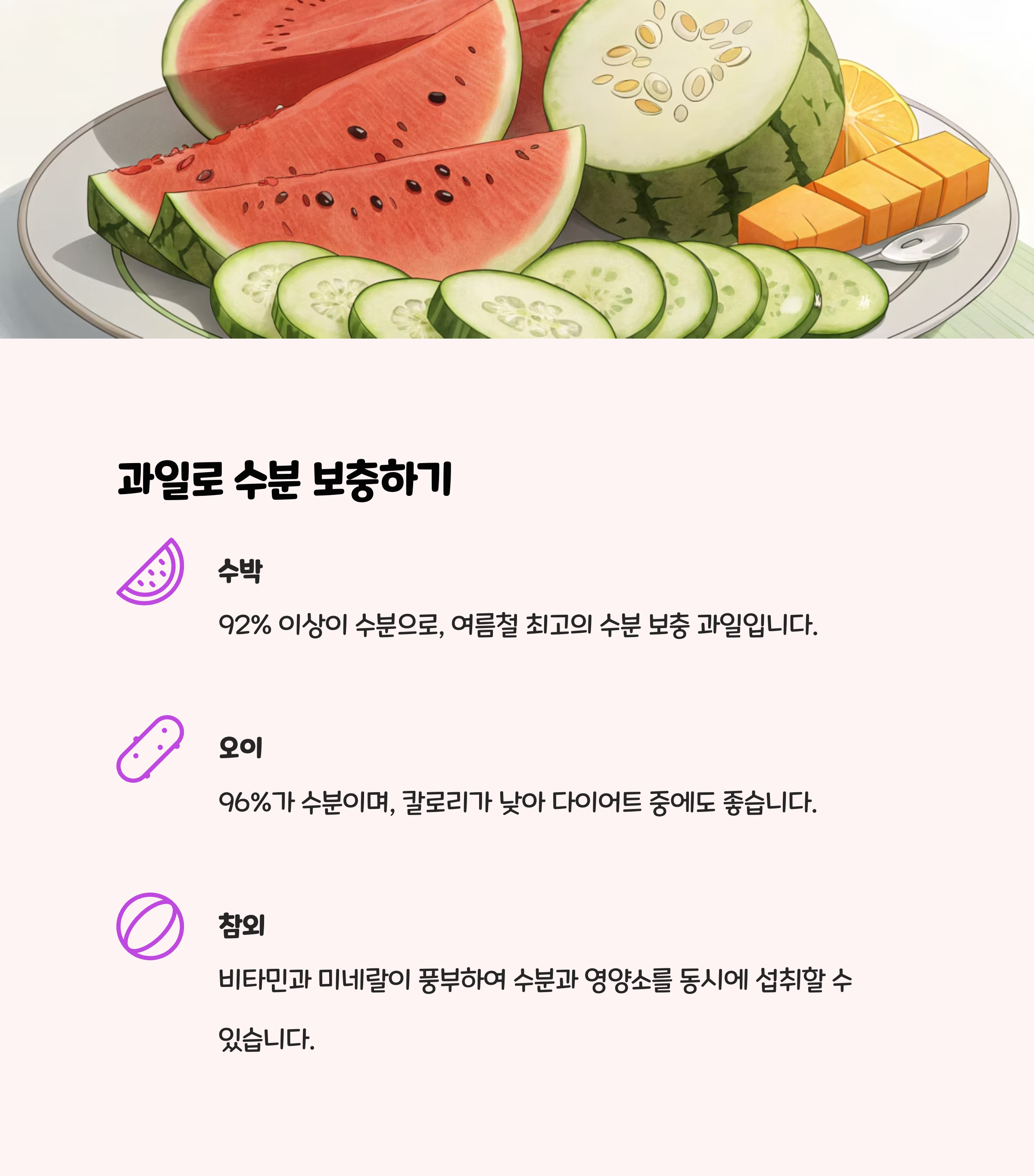 이온음료로 전해질도 함께 보충하세요. 단, 이온음료는 당분이 많으니 물과 번갈아 섭취하는 것이 좋습니다. 카페인 음료, 알코올, 지나치게 찬 음료는 오히려 탈수를 유발할 수 있으니 주의해야 합니다.- 수분이 풍부한 과일(수박, 참외 등)을 함께 섭취하면 수분 보충에 도움이 됩니다.