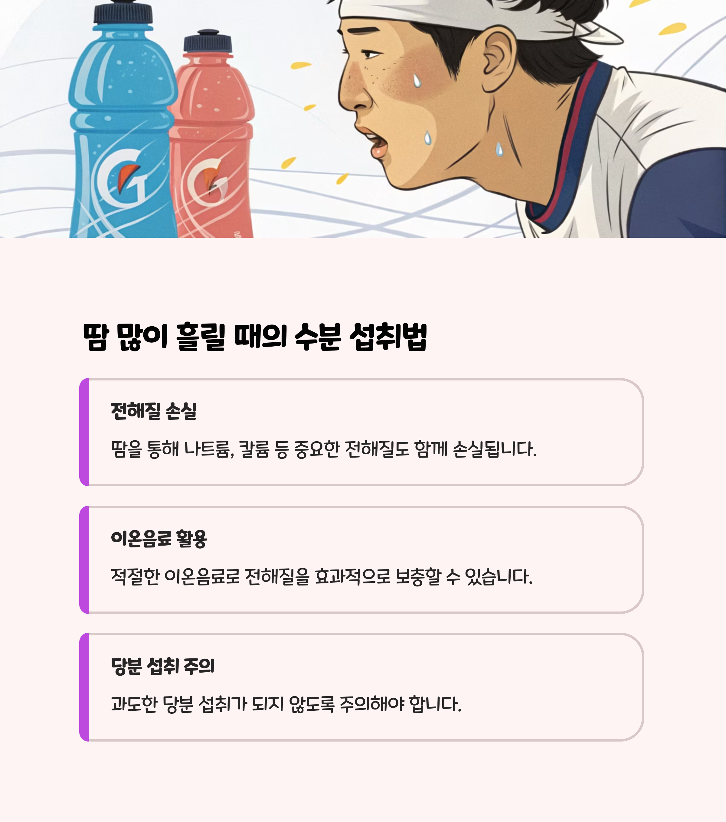 • 땀을 많이 흘렸다면 이온음료로 전해질도 함께 보충하세요. 단, 이온음료는 당분이 많으니 물과 번갈아 섭취하는 것이 좋습니다.