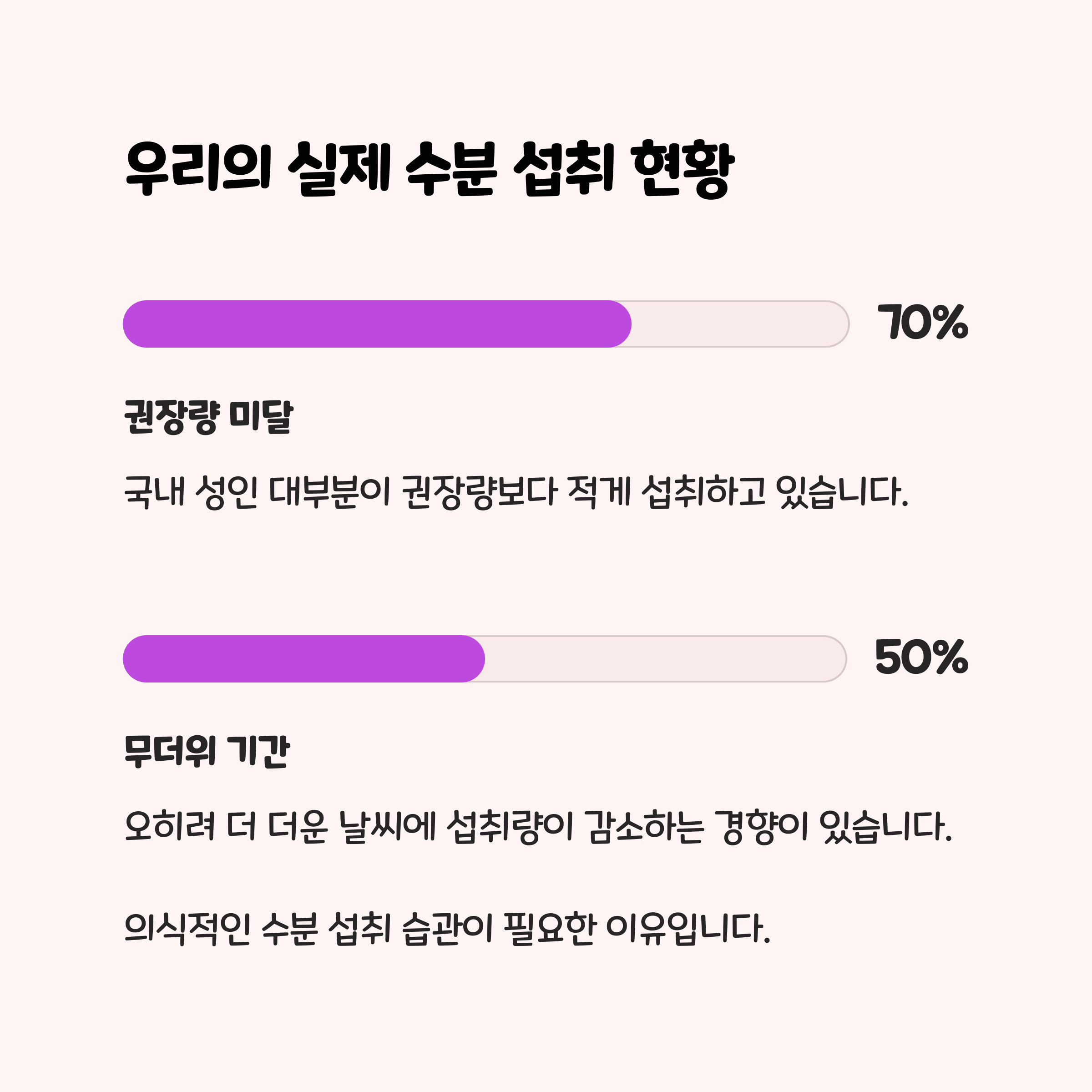 - 소변 색이 진해지거나 2시간 이상 소변이 없으면 수분 부족 신호이므로 즉시 물을 마셔야 합니다.