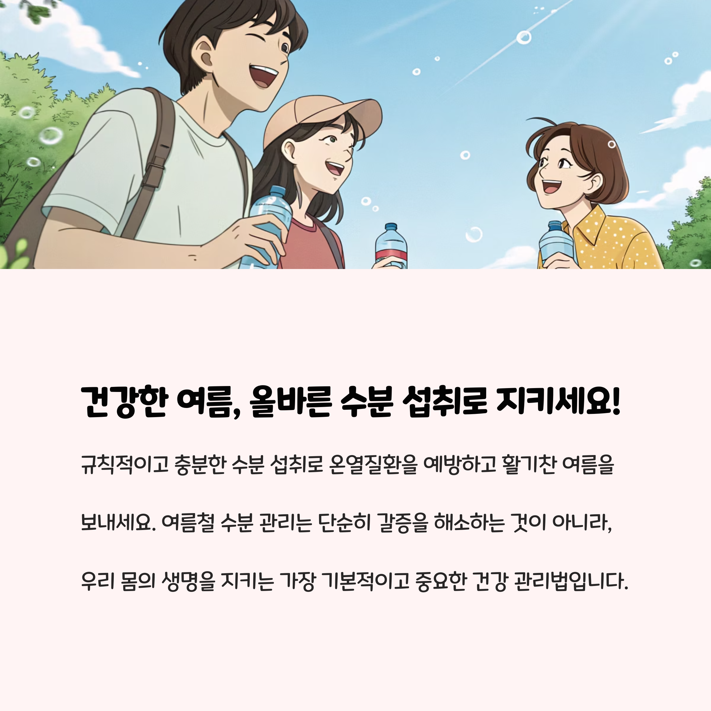 여름철에는 작은 습관 변화만으로도 건강을 크게 지킬 수 있습니다. 정기적으로 물을 마시고, 내 몸의 신호에 귀 기울이면 온열질환 걱정 없이 시원하고 안전한 여름을 보낼 수 있습니다. 오늘부터 올바른 수분 섭취로 건강을 지켜보세요!