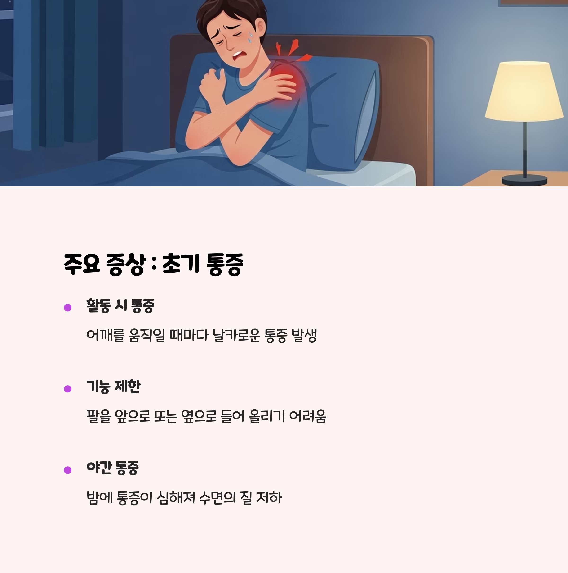 초기에는 어깨에서 뻐근한 통증이 나타나며, 점점 팔을 들거나 돌릴 때 움직임에 제한이 생깁니다. 특히 옷 입기, 머리 빗기, 뒷주머니에 손 넣기 등이 힘들어집니다. 밤에는 통증이 심해져 불면을 겪기도 합니다.