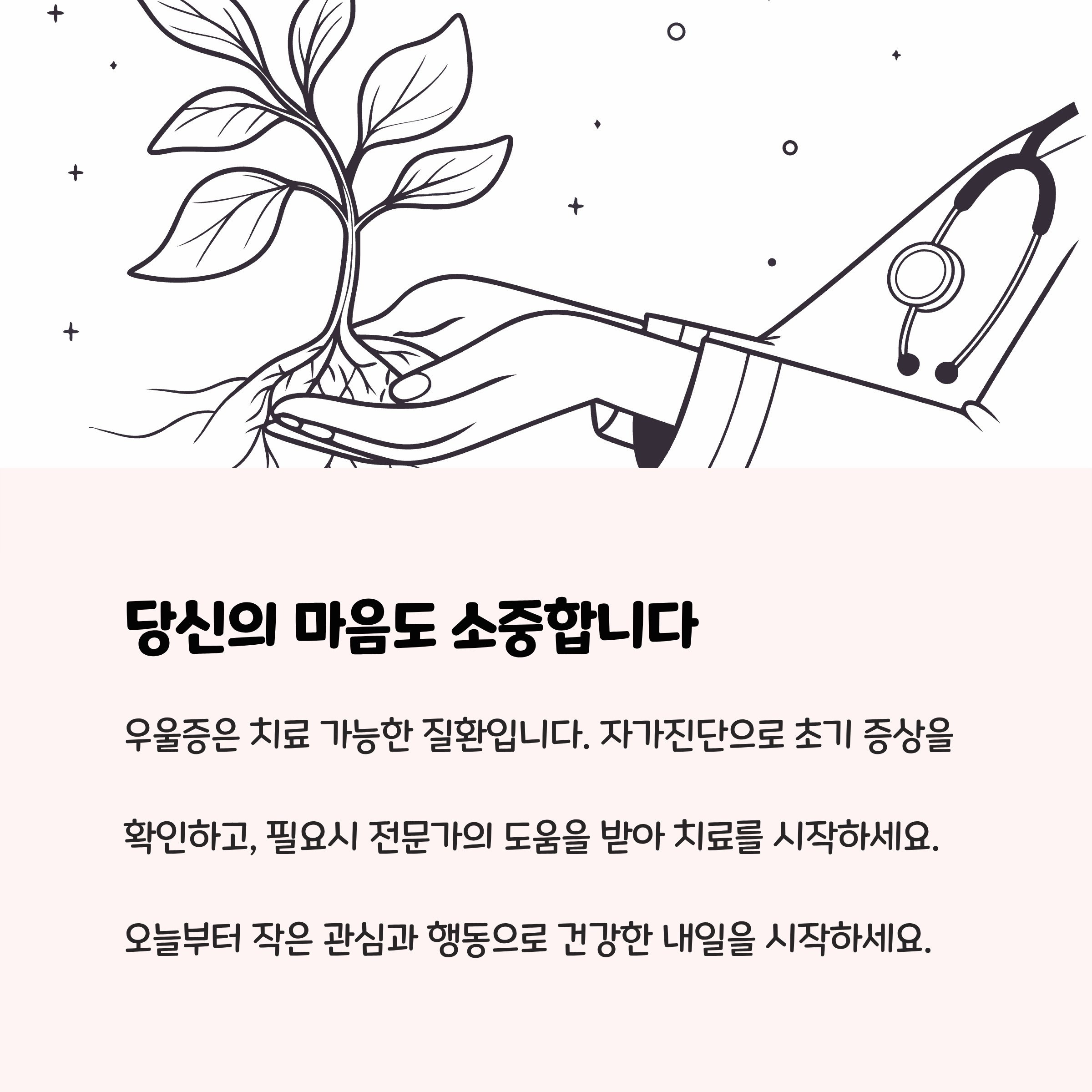 우울증은 결코 혼자 극복해야 할 문제가 아니며, 정확한 진단과 전문적인 치료, 그리고 가족과 사회의 따뜻한 지원이 함께할 때 건강하게 이겨낼 수 있습니다. 자가 진단을 통해 자신의 상태를 점검하고, 증상이 의심된다면 망설이지 말고 전문가의 상담을 받으세요.