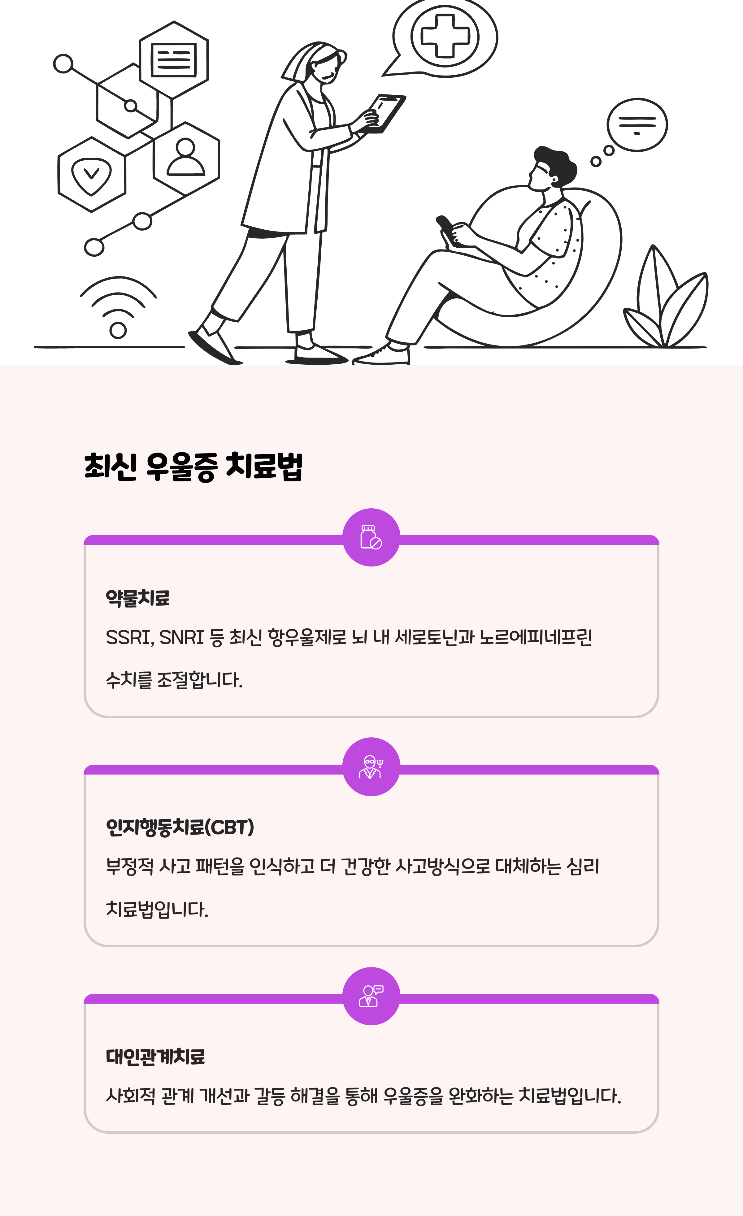 진단에 기초해 약물 치료, 심리치료(인지행동치료, 대인관계 치료 등), 생활습관 개선, 사회적 지원 등 맞춤형 치료 프로그램이 만들어집니다.