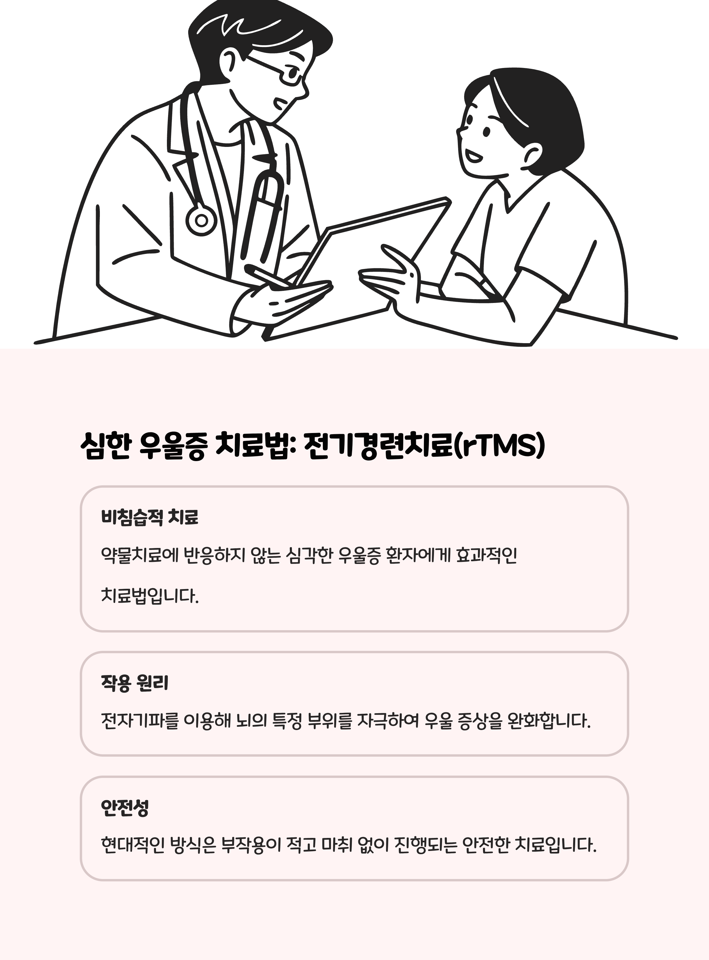 | 기타 치료법 | 전기경련치료(ECT), 반복적 경두개자기자극술(rTMS) 등 | 중증 우울증에 적용, 전문기관에서 실시 |