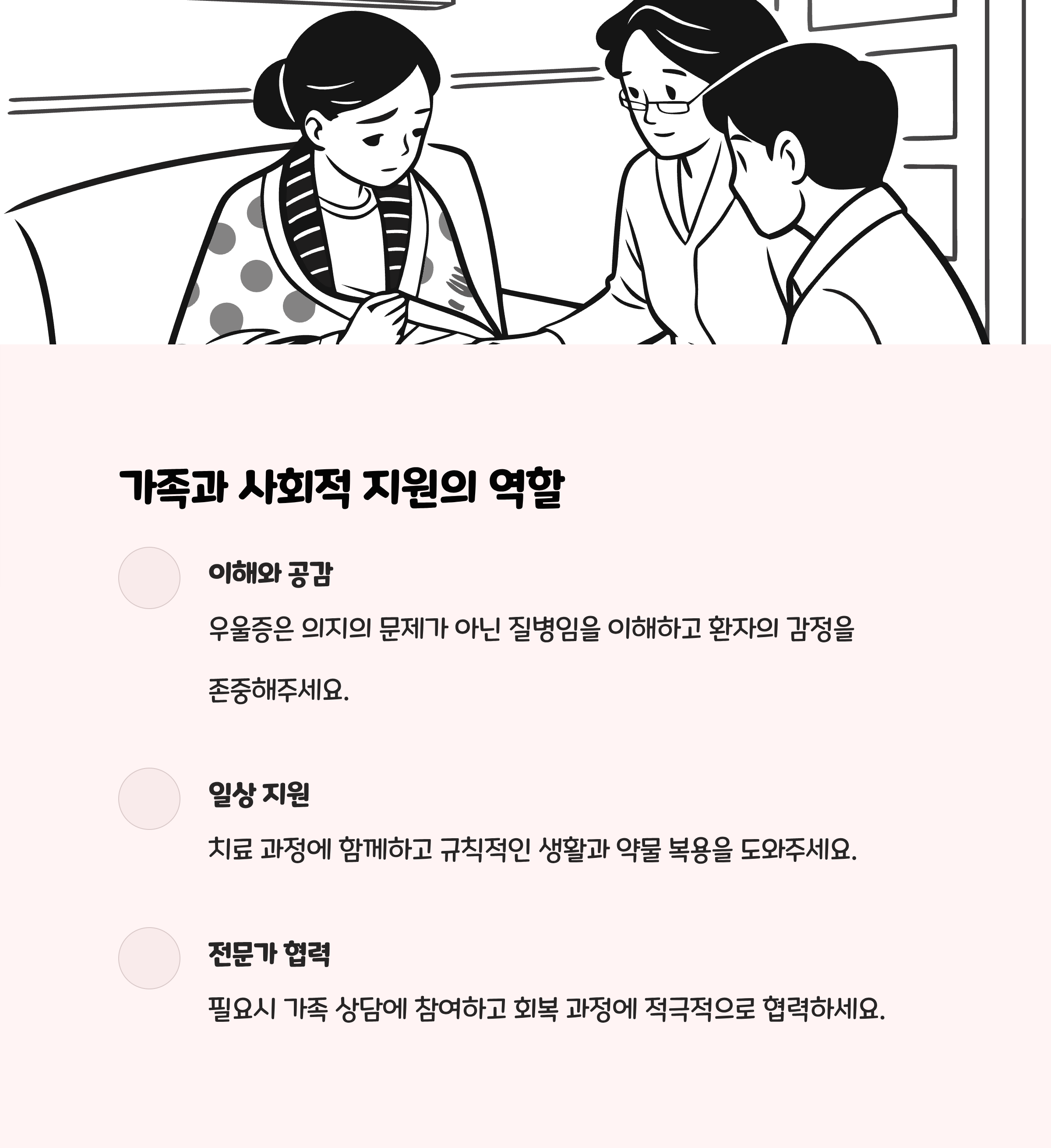 조기 발견과 개입: 증상이 심각해지기 전에 적절한 자가 진단과 전문가 상담을 받는 것이 무엇보다 중요합니다.지속적 치료와 신뢰: 치료 과정 중 중단하지 않고, 전문의와 신뢰 관계를 유지하며 치료에 임하는 것이 완치에 필수입니다.가족과 사회적 지지: 우울증 극복에는 가족의 따뜻한 이해와 지지, 사회적 지원 역시 큰 힘이 됩니다.