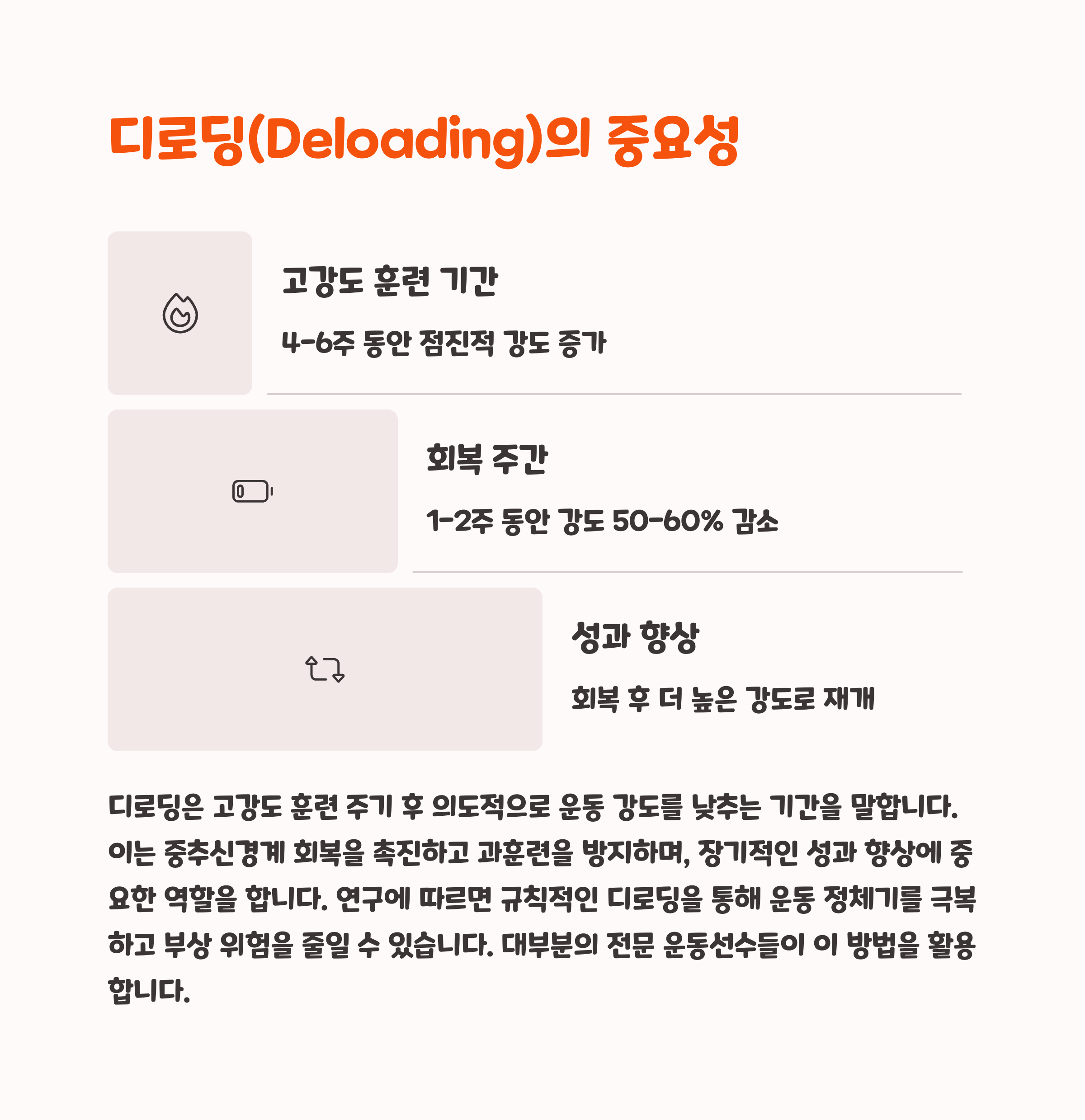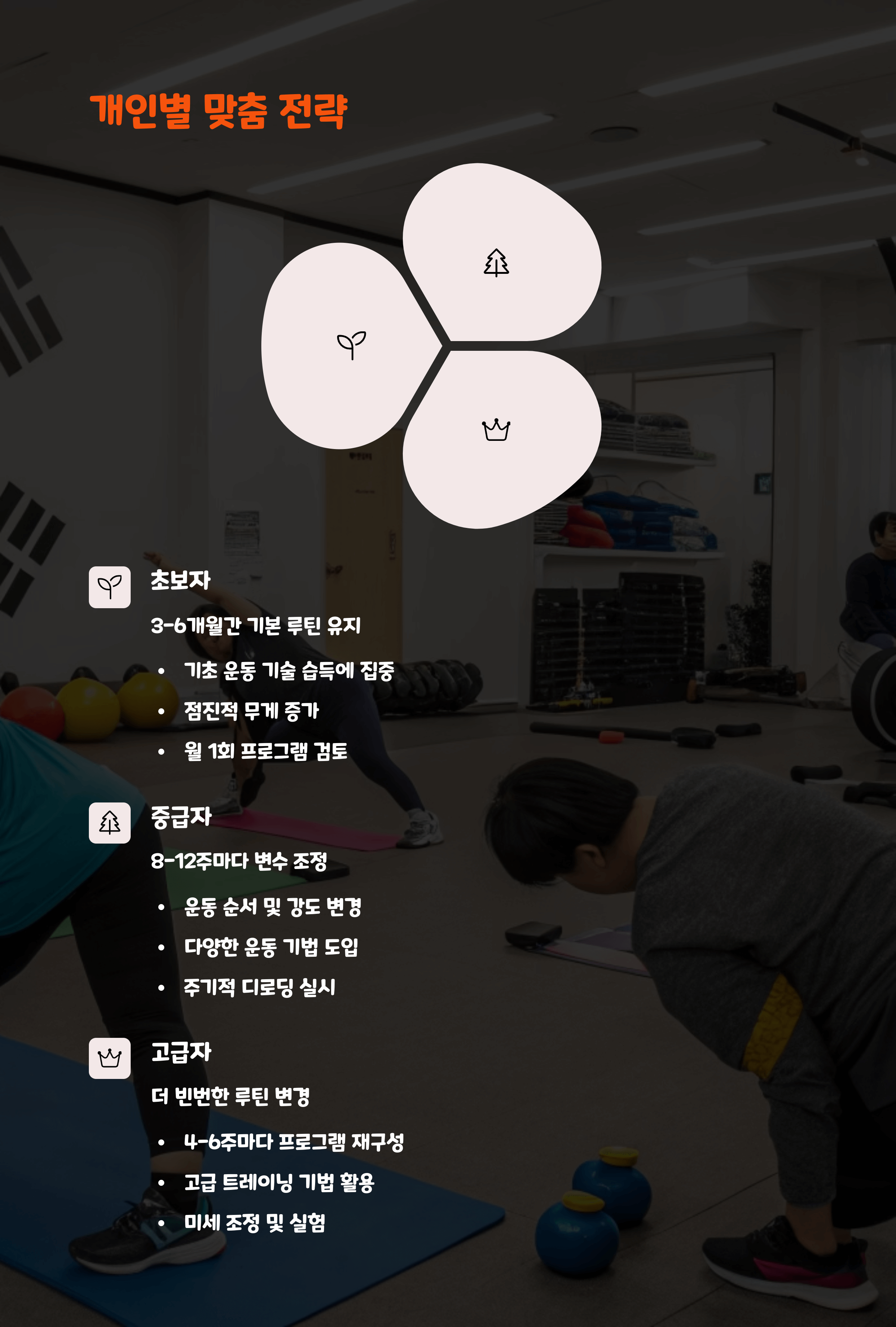 | 과부하 원칙 적용 | 8~12주 유지 후 변경 추천 | 체계적인 계획 필수 |