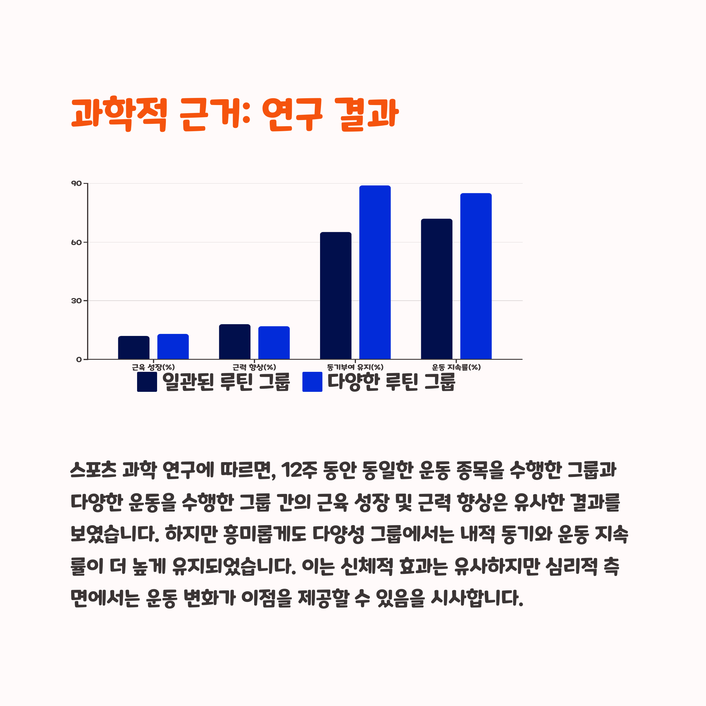 운동 루틴을 바꾸는 것이 효과적이라는 주장은 근육의 적응 효과 때문입니다. 근육은 반복적인 자극에 적응하면서 성장하지만, 동일한 운동을 오랫동안 지속하면 자극이 줄어들어 발전 속도가 느려질 수 있습니다. 예를 들어, **매주 같은 무게와 같은 횟수로 스쿼트를 한다면** 초기에는 효과가 크지만 점차 근육이 적응하여 더 이상 성장하지 않을 수 있습니다. 이럴 때 **운동 방식을 바꾸거나 새로운 동작을 추가하면** 신체가 새로운 자극을 받아 성장할 기회를 얻게 됩니다.