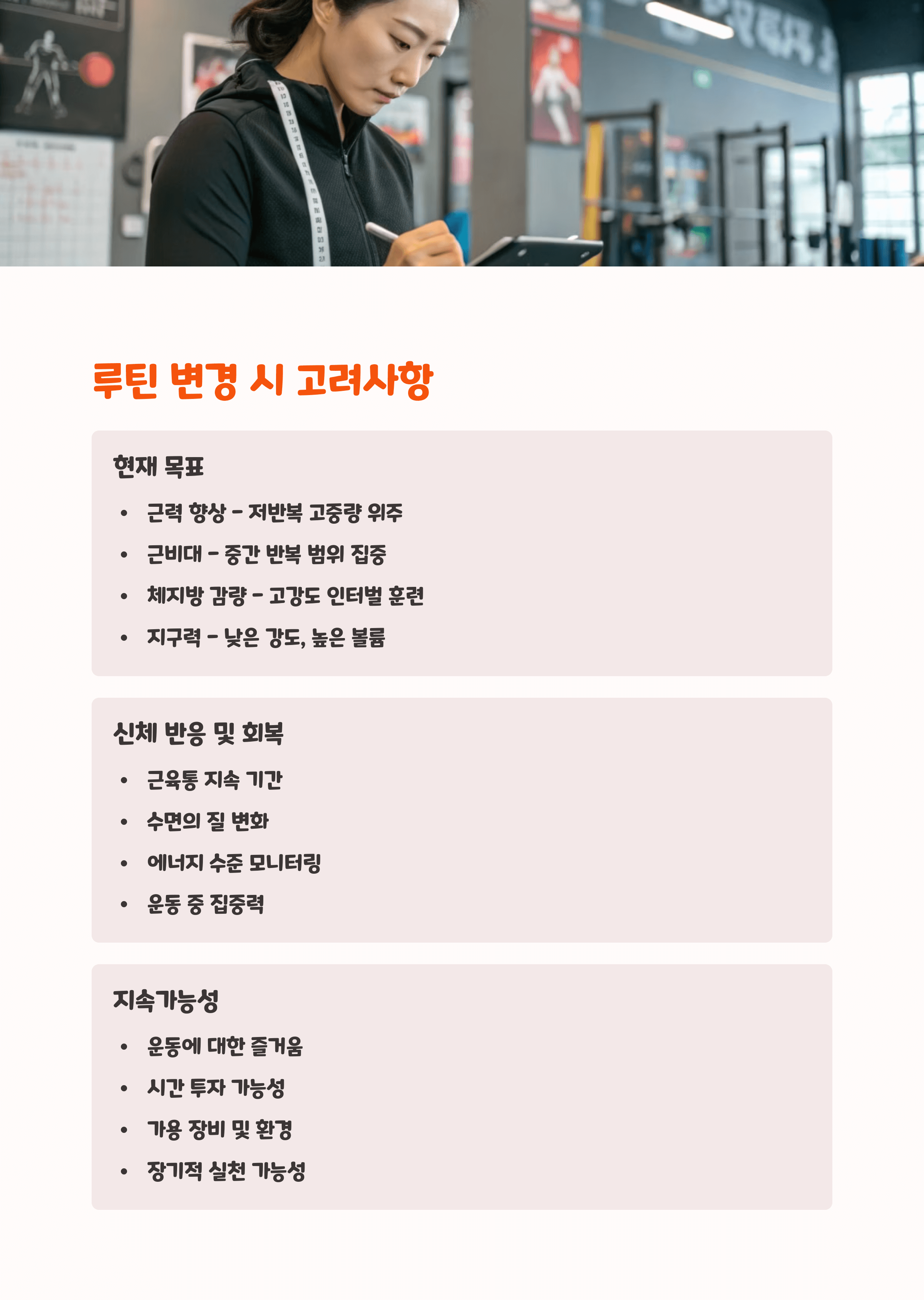 | 운동 루틴 변경 | 근육 적응 방지를 위한 전략적 접근 |
