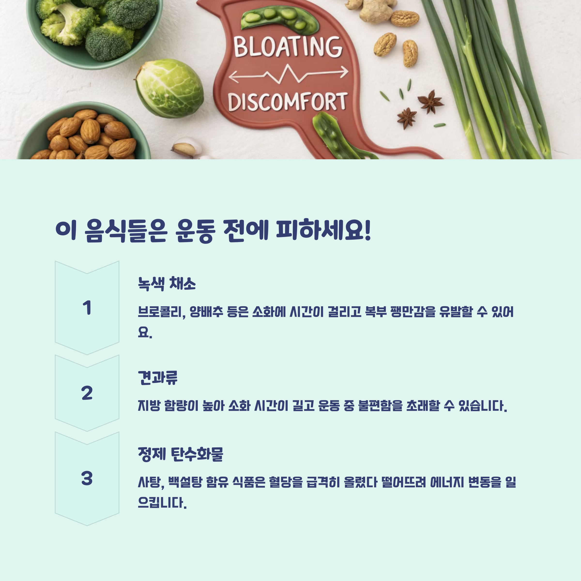녹색 채소는 식이섬유 함량이 높아 소화 과정에서 가스를 많이 발생시킵니다. 이는 복부 팽만감과 불편함을 유발해 운동에 방해가 될 수 있습니다.