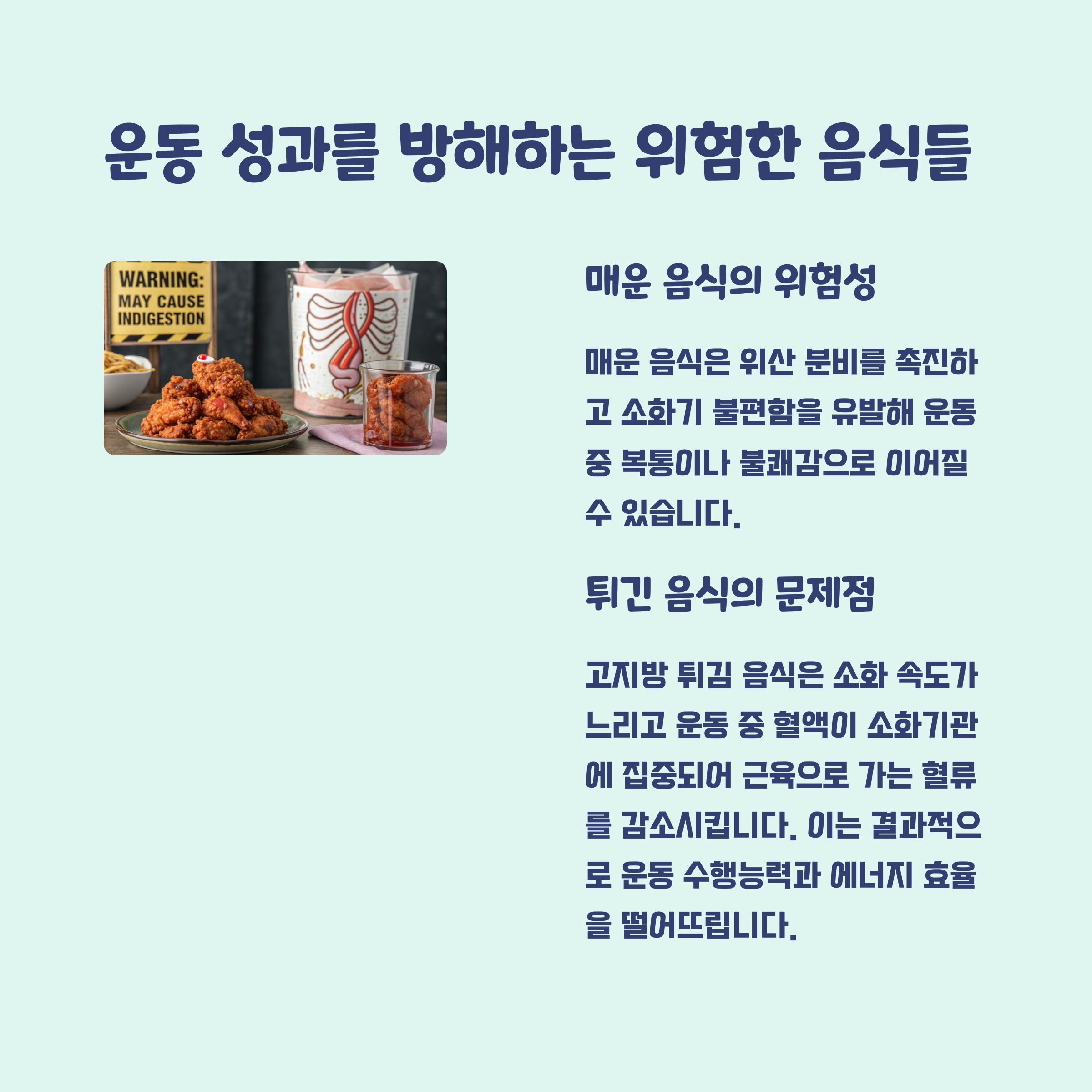 튀긴 음식은 소화에 부담을 주고 위산 역류를 유발할 위험이 있습니다. 지방 함량이 높아 혈액순환에도 악영향을 미칠 수 있으니 운동 전에는 삼가는 것이 좋습니다.