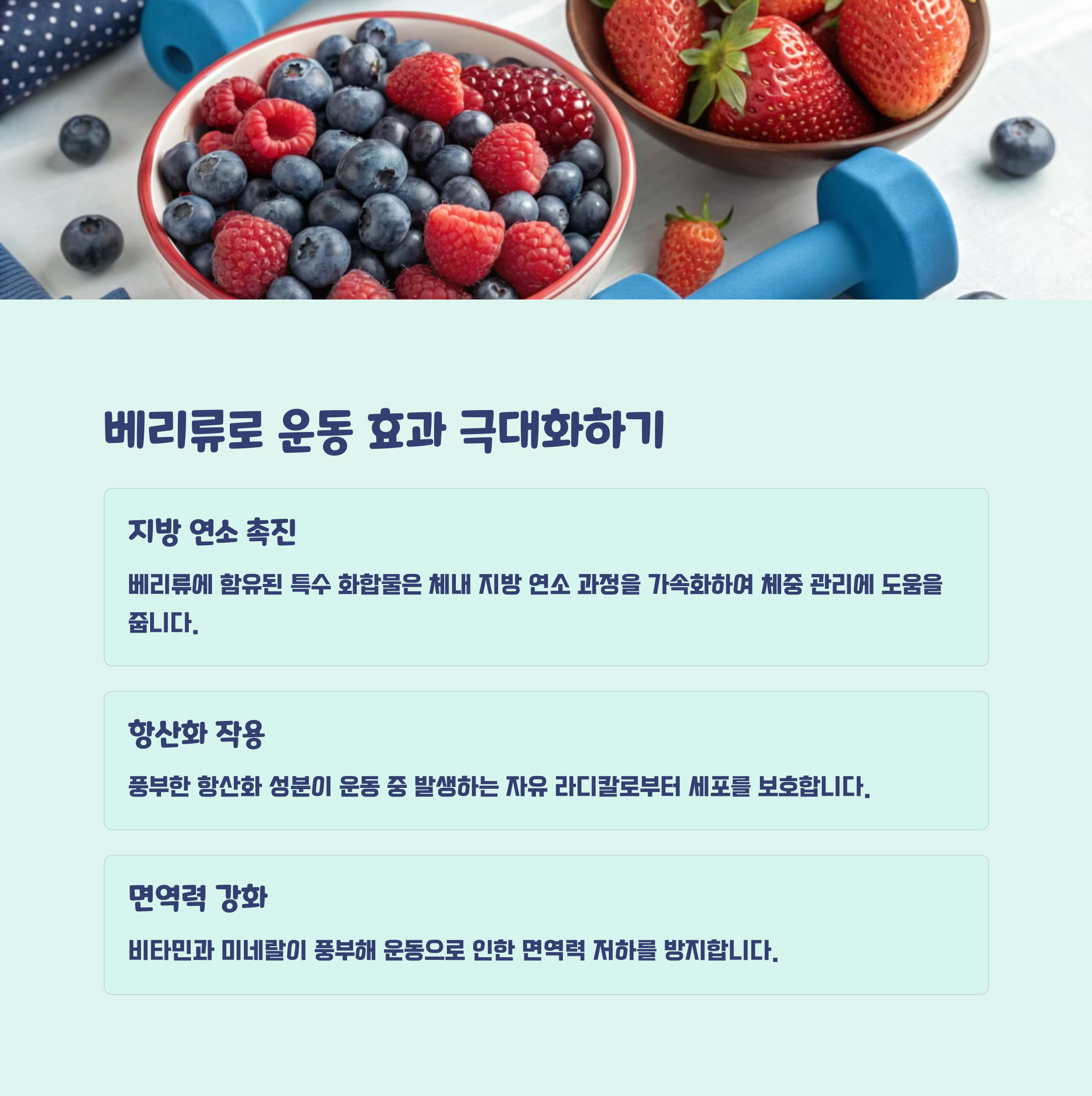 딸기, 블루베리 등 베리류는 항산화 성분이 풍부해 신진대사를 촉진하고 지방 분해를 돕습니다. 연구에 따르면, 운동 전에 베리류를 섭취하면 지방 연소가 약 30% 증가한다고 합니다.