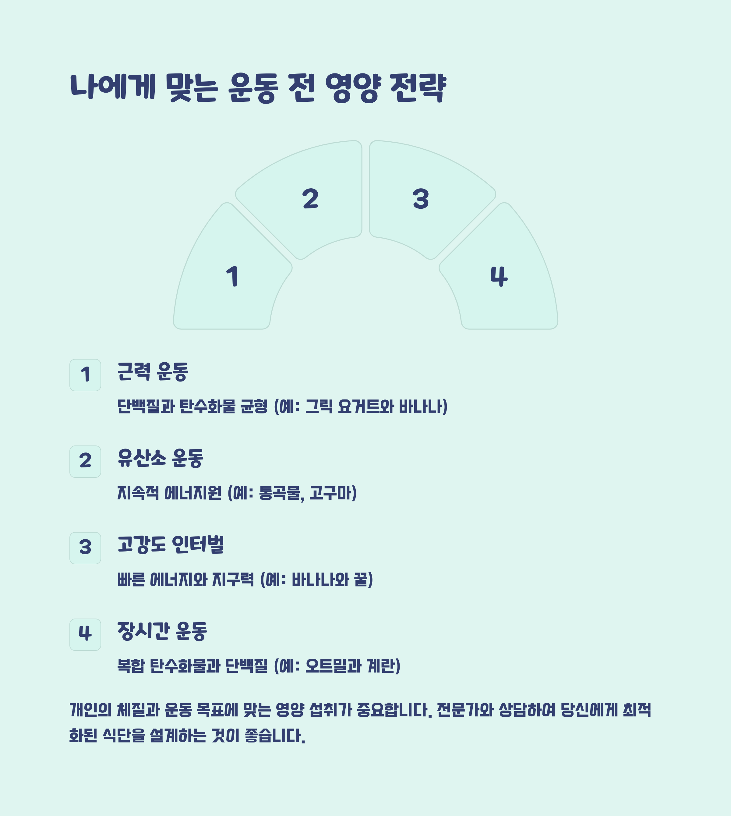 운동 전 올바른 식단 선택은 더 나은 퍼포먼스와 효율적인 체력 관리를 가능하게 합니다. 자신의 몸 상태와 운동 강도에 맞는 음식을 섭취하여 최고의 결과를 얻으세요!