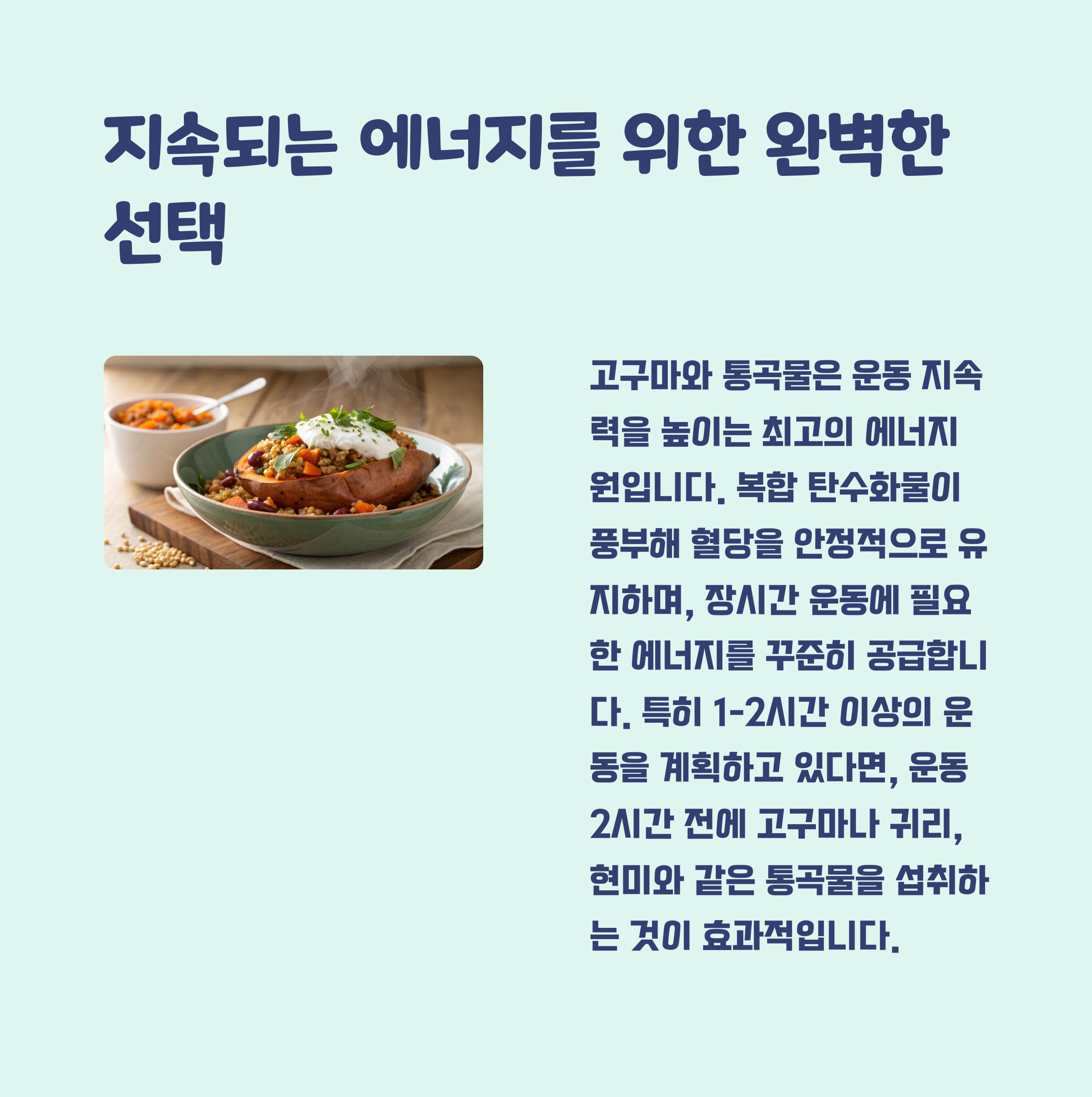 고구마는 복합 탄수화물과 비타민 C, 베타카로틴이 풍부해 운동 중 지속적인 에너지를 제공합니다. 다만, 소화 속도가 느리므로 운동 2시간 전에 섭취하는 것이 좋습니다.